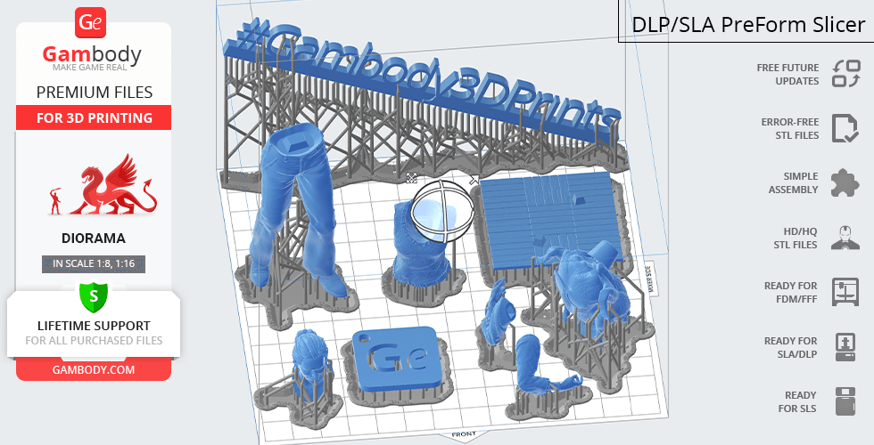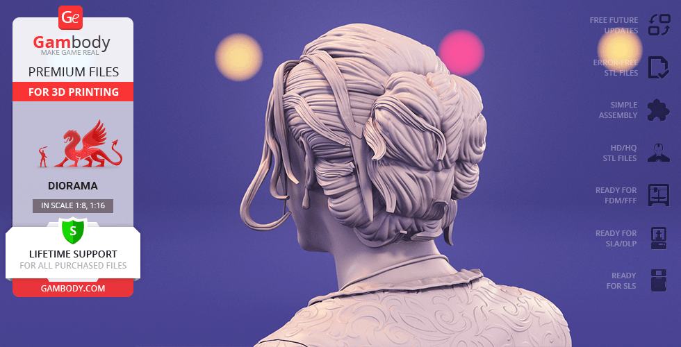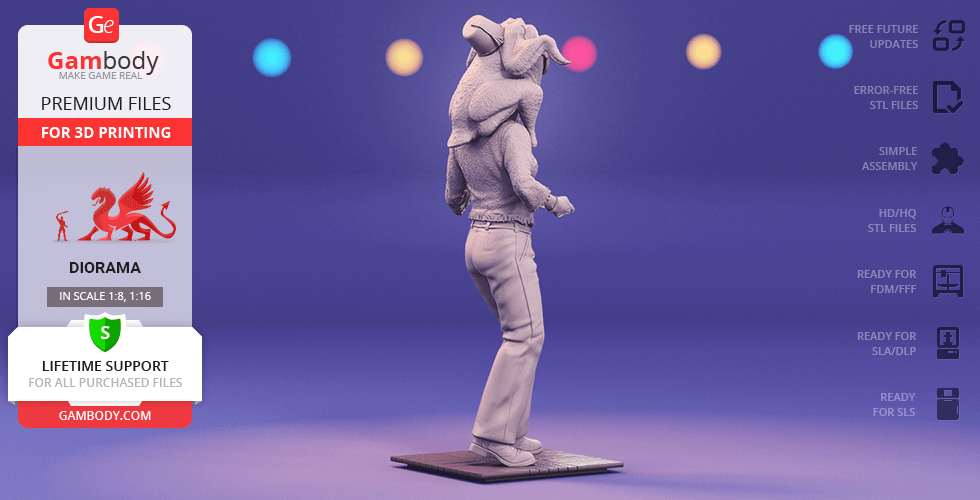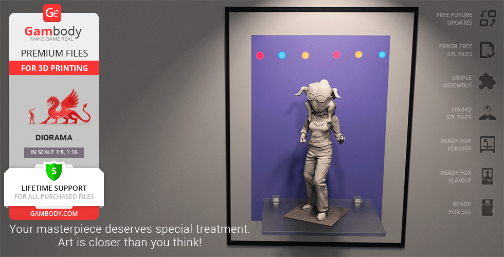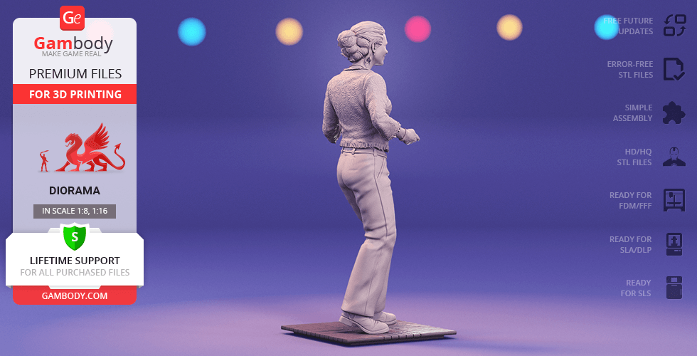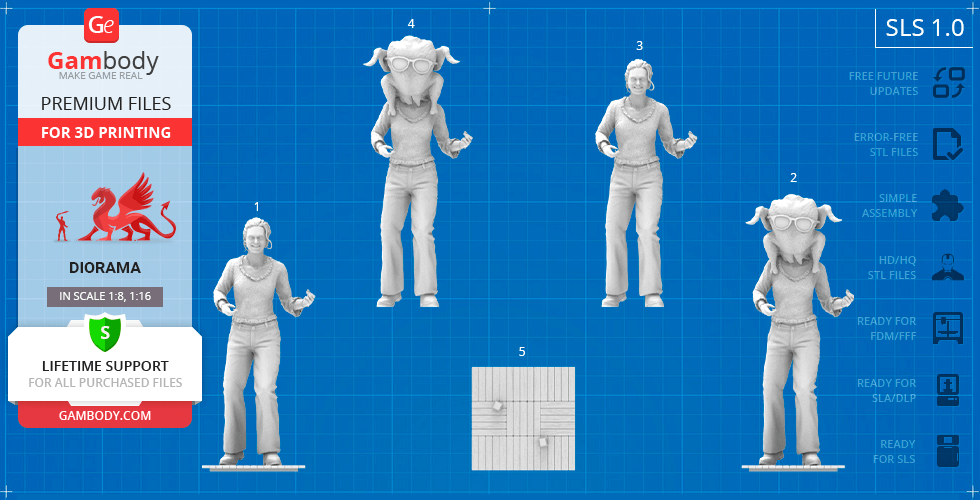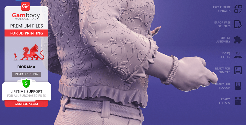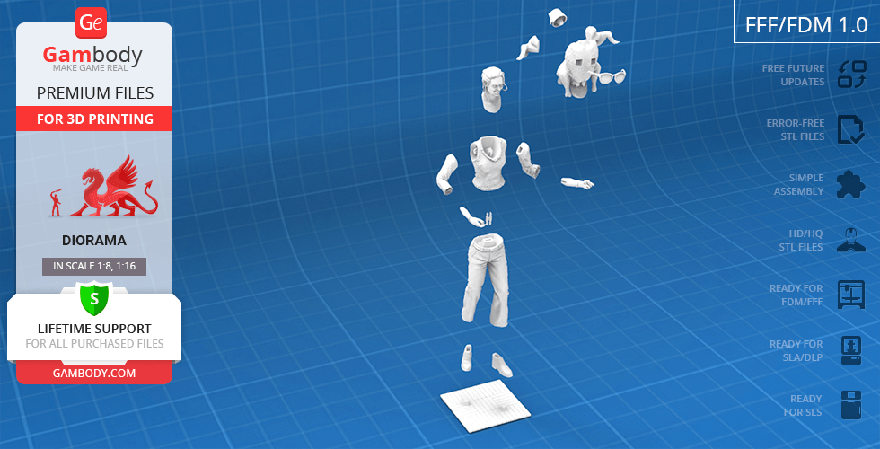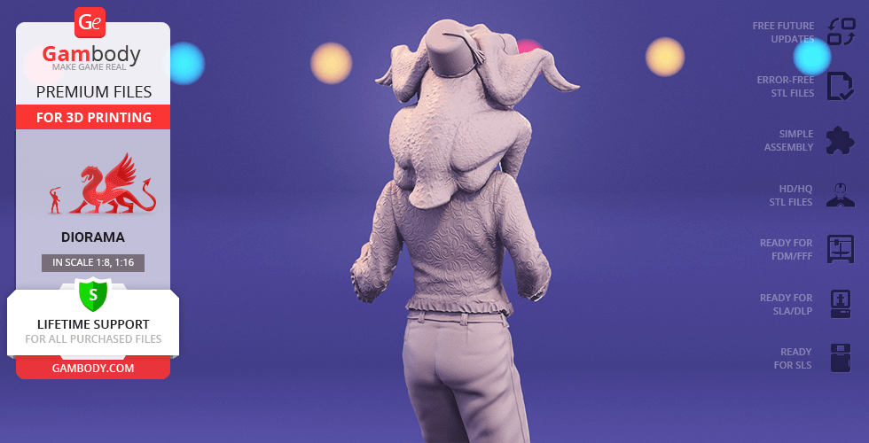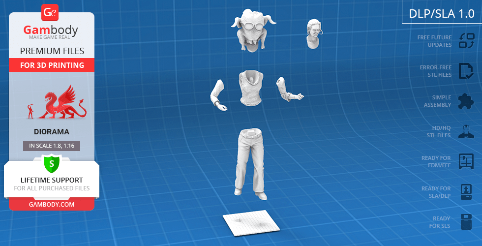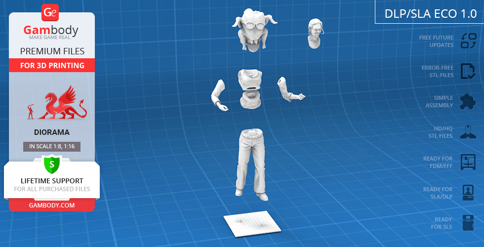- STL files of Monica Geller 3D Model for 3D printing which consist of 35 parts;- 4 versions of files for this model for FFF/FDM, DLP/SLA, DLP/SLA Eco and SLS;- High-poly detailed figurine of Monica Geller;- Assembly Manual for FFF/FDM 1.0 and DLP/SLA 1.0 versions in PDF format;- Detailed settings that we provide as a recommendation for Cura , Simplify3D and Slic3r for the best print;- Full technical support from the Gambody Support Team.