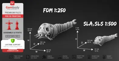 Scale: Mothra Larva height is 53000 mm. The scale of this model made in proportion to it. 1/250 for FDM version and 1/500 for SLA/SLS version.