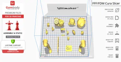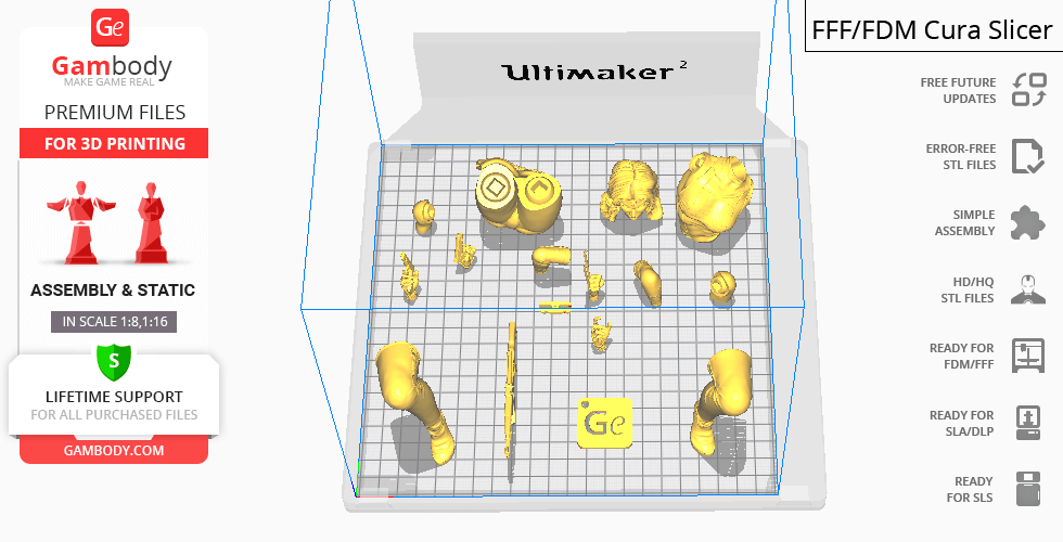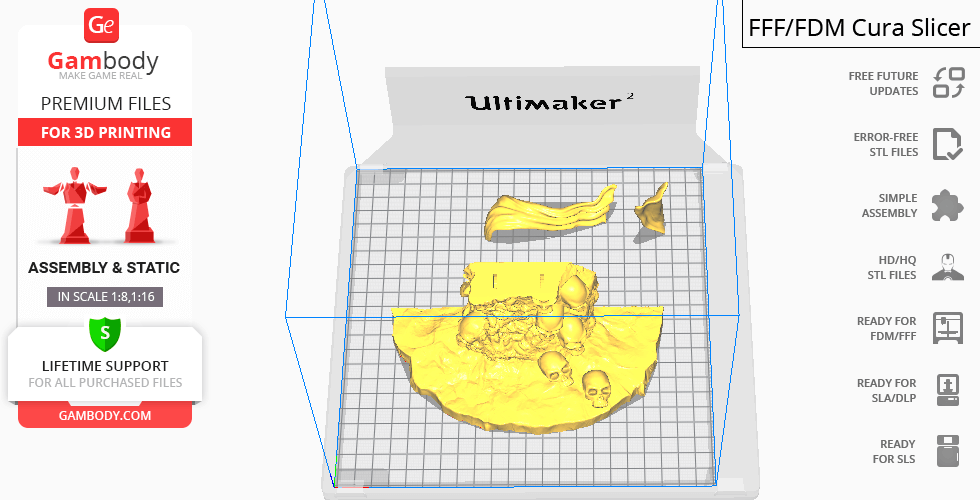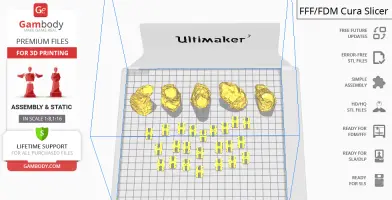 FFF/FDM 1.0 version features:- Contains 26 parts;- A printed model is 235 mm tall, 186 mm wide, 169 mm deep;- Assembly kit includes locks to connect parts securely without glue. One lock 25_ge_lock_10H(x25) needs to be printed 25 times and another one 26_ge_lock_7S(x1) needs to be printed once;- Three variants of the right hand are available, each holding a different weapon;- Made with a platform to resemble a hand-like stone throne;- All parts are divided in such a way that you will print them with the smallest number of support structures.