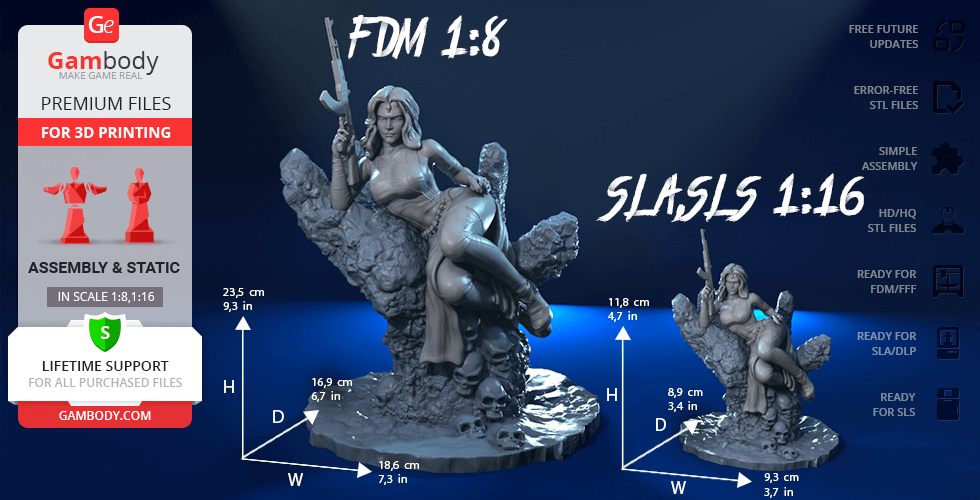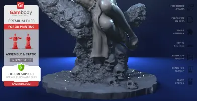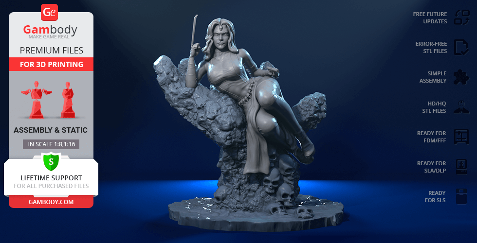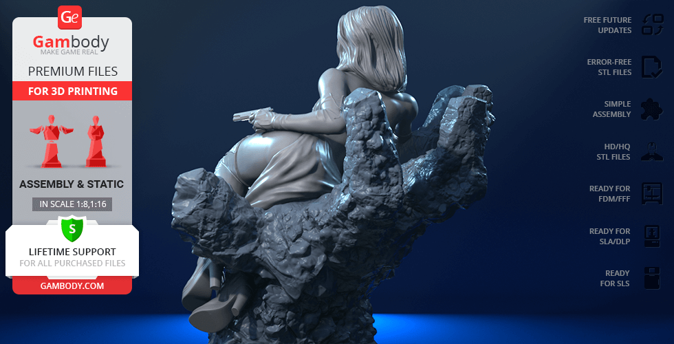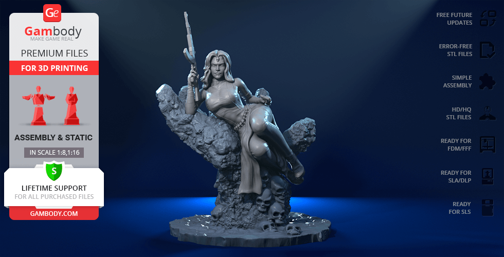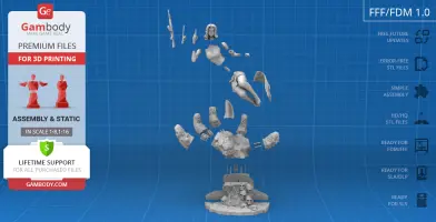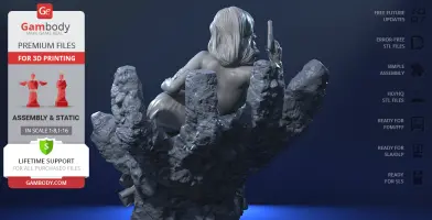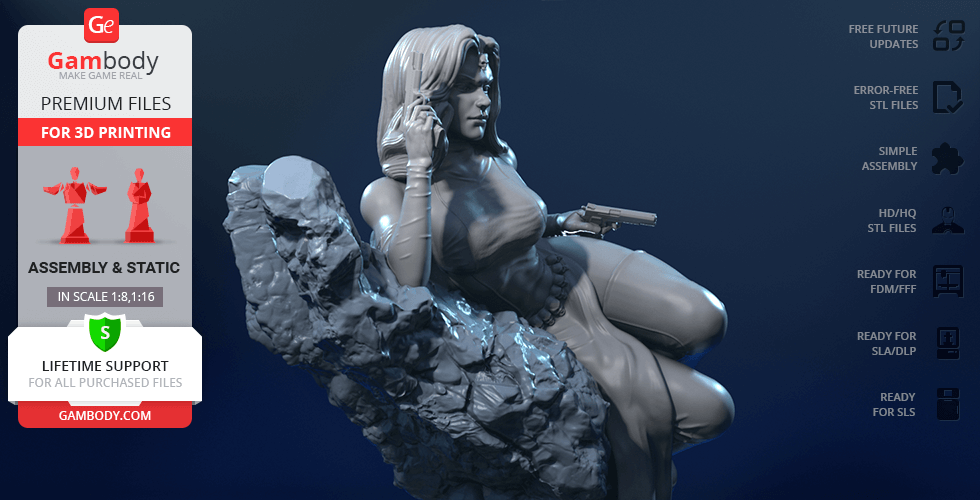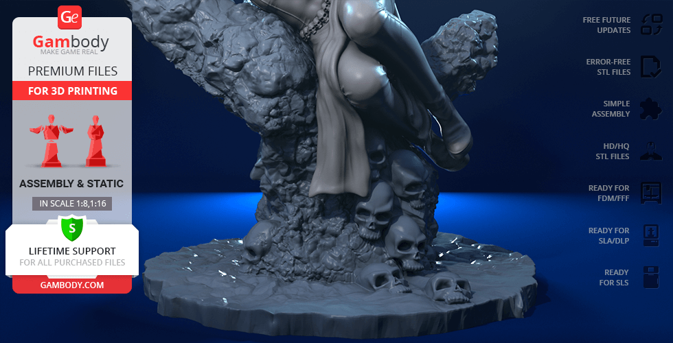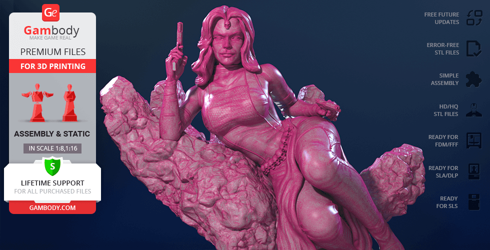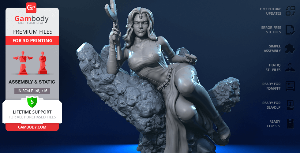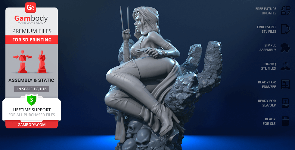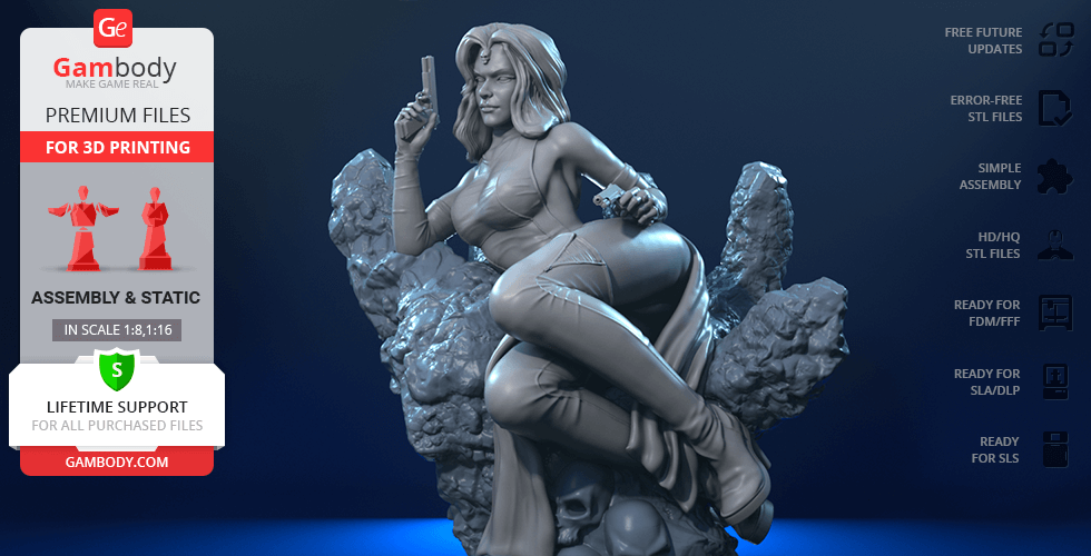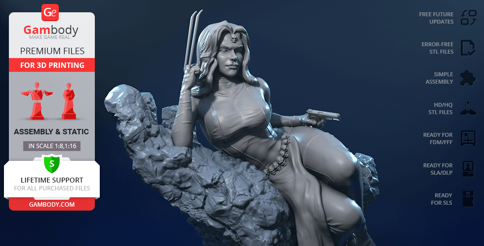 Mystique figurine for 3D printing is a static assembly model and its moderation and adaptation for different types of 3D printers took Gambody team 33 hours in total. The figurine’s anatomy was thoroughly reviewed during the moderation process for Mystique to be depicted harmoniously in the intended sitting pose. The model’s cutting was chosen by our team to minimise the amount of filament needed for generated support and some of the parts were hollowed out for you to save resin. Moreover, in order to conceal the places where assembly parts of the model must be connected, the figurine was cut along the contour of Mystique clothes’ seams. The figurine's platform that resembles the hand-like stone throne was divided into 8 separate parts to fit even the smallest 3D printers’ build plates. There are three different weapon variants of the model’s right hand available for you to choose either gun, assault rifle or Wolverine’s claws to assemble Mystique with. Each hand, as well as the assault rifle, are provided as separate parts for you to achieve the cleanest result possible. All the assembly parts are provided in STL files in recommended positions that were worked out so to ensure the smoothness of the details’ surfaces after printing and that the 3D printing beginners won't face difficulties when placing the parts on a build plate.