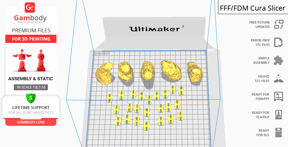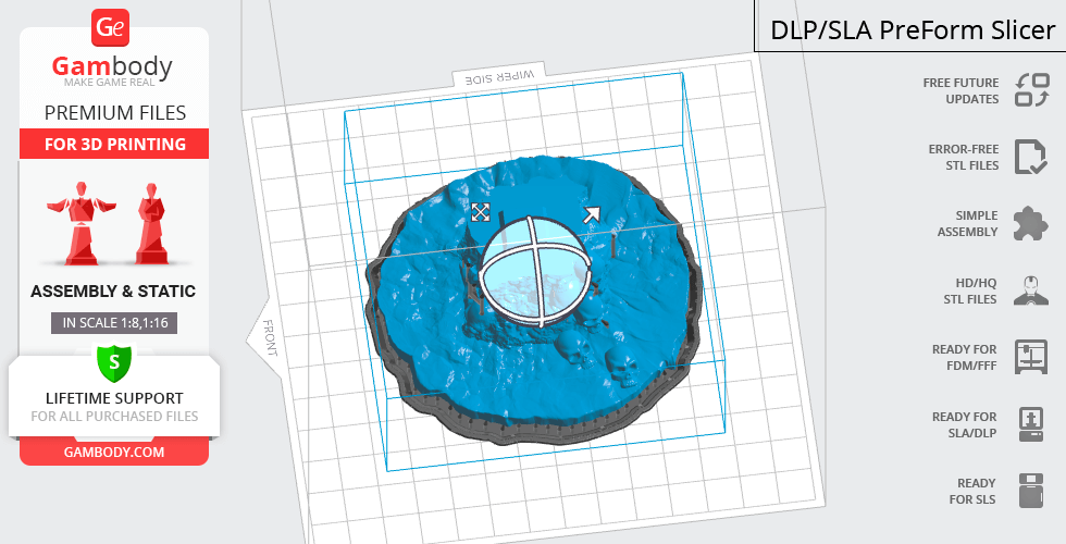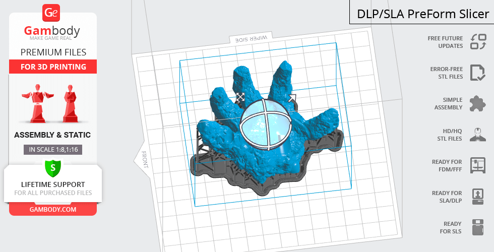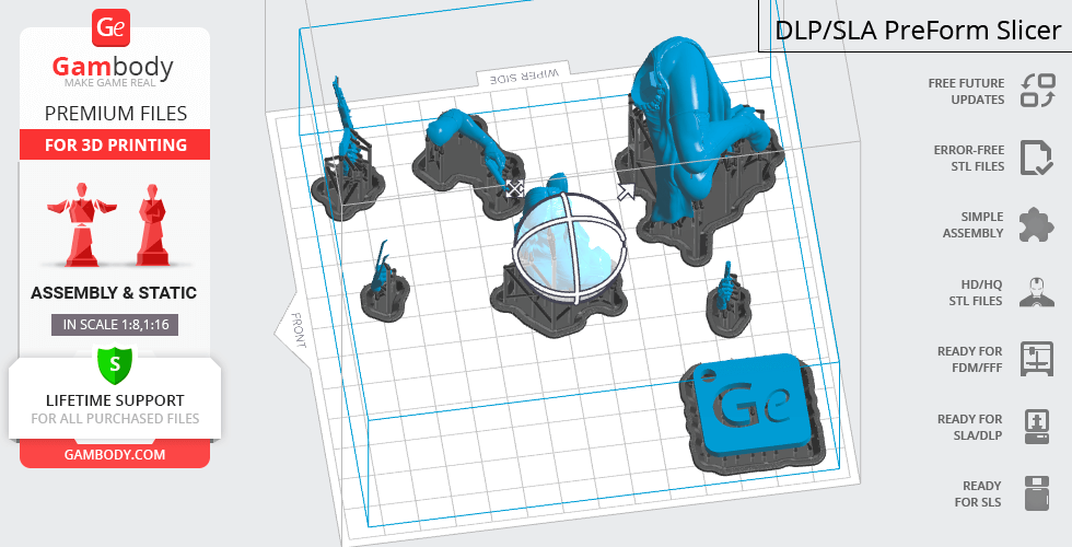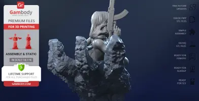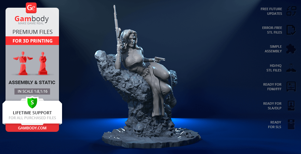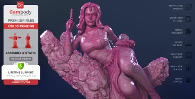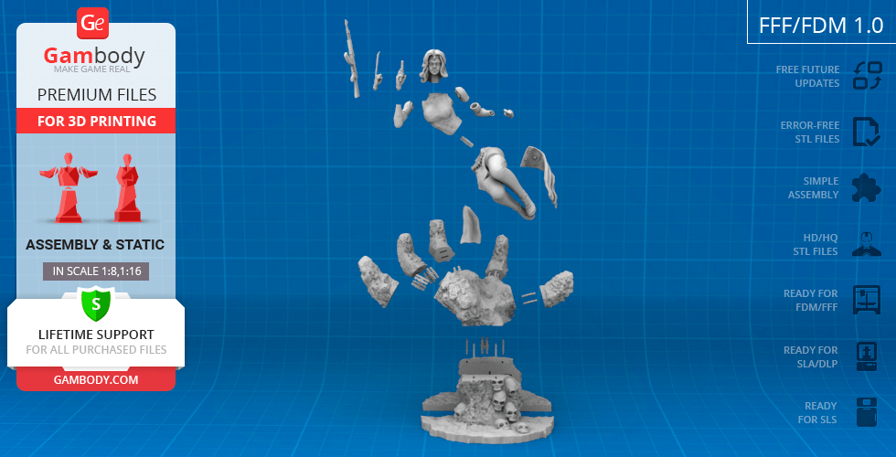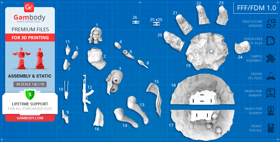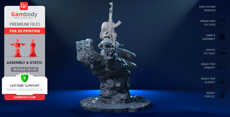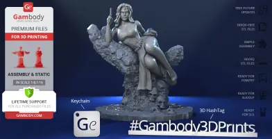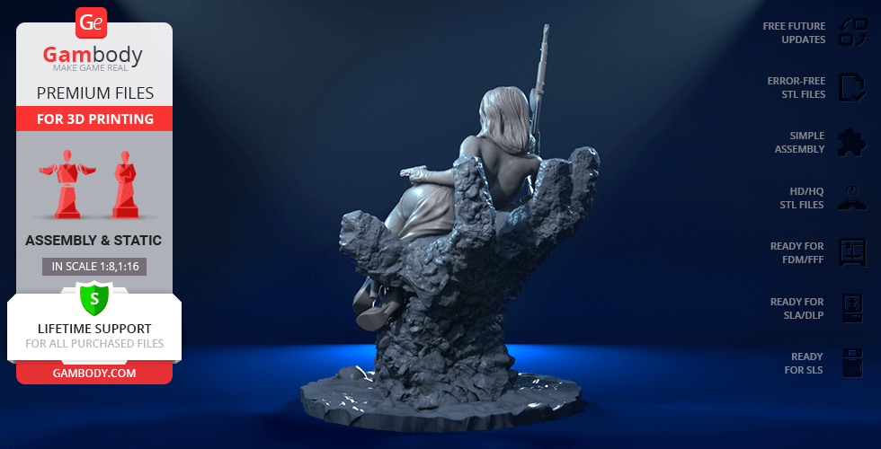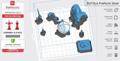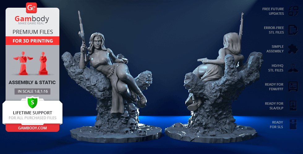 Mystique figurine for 3D printing is a static assembly model and its moderation and adaptation for different types of 3D printers took Gambody team 33 hours in total. The figurine’s anatomy was thoroughly reviewed during the moderation process for Mystique to be depicted harmoniously in the intended sitting pose. The model’s cutting was chosen by our team to minimise the amount of filament needed for generated support and some of the parts were hollowed out for you to save resin. Moreover, in order to conceal the places where assembly parts of the model must be connected, the figurine was cut along the contour of Mystique clothes’ seams. The figurine's platform that resembles the hand-like stone throne was divided into 8 separate parts to fit even the smallest 3D printers’ build plates. There are three different weapon variants of the model’s right hand available for you to choose either gun, assault rifle or Wolverine’s claws to assemble Mystique with. Each hand, as well as the assault rifle, are provided as separate parts for you to achieve the cleanest result possible. All the assembly parts are provided in STL files in recommended positions that were worked out so to ensure the smoothness of the details’ surfaces after printing and that the 3D printing beginners won't face difficulties when placing the parts on a build plate.
