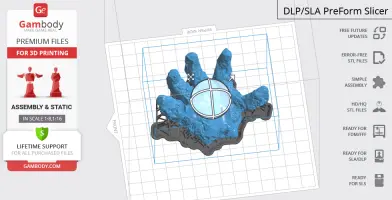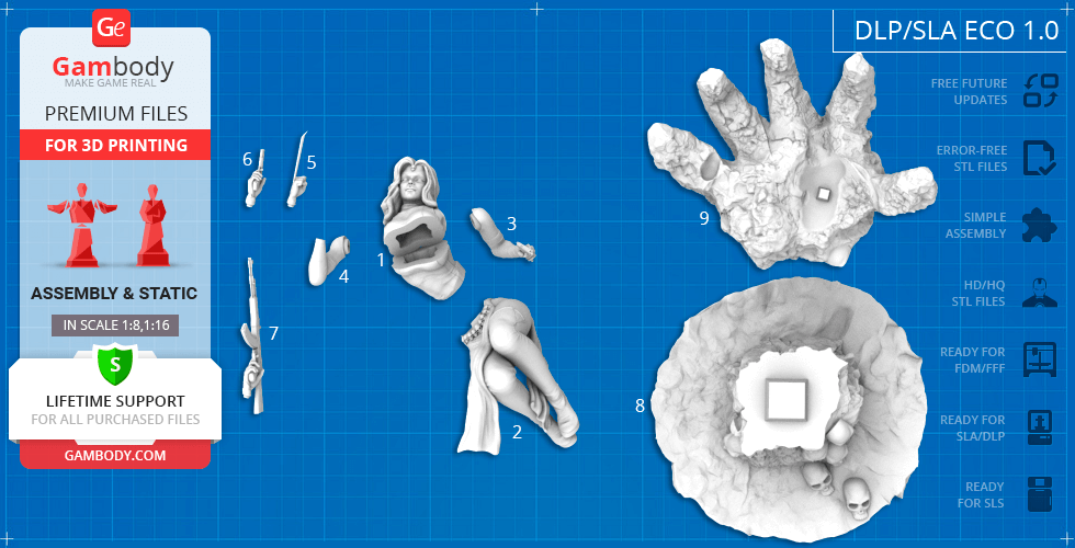 DLP/SLA Eco 1.0 version features:- Contains 9 parts;- A printed model is 118 mm tall, 93 mm wide, 89 mm deep;- Three variants of the right hand are available, each holding a different weapon;- Made with a platform to resemble a hand-like stone throne;- Contains some hollowed out parts to save resin.