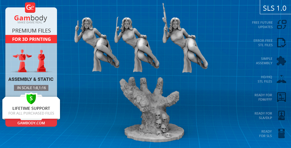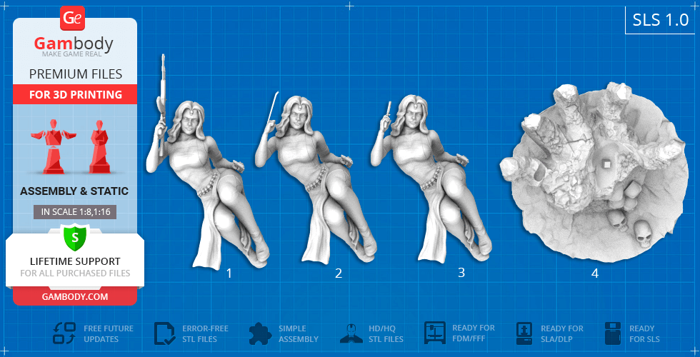 SLS 1.0 version features:- Made as a solid one-piece figurine;- A printed model is 118 mm tall, 93 mm wide, 89 mm deep;- Contains 4 parts - three variants of a one-piece model wielding a different weapon and a platform separated.