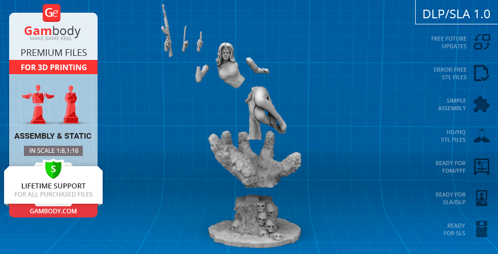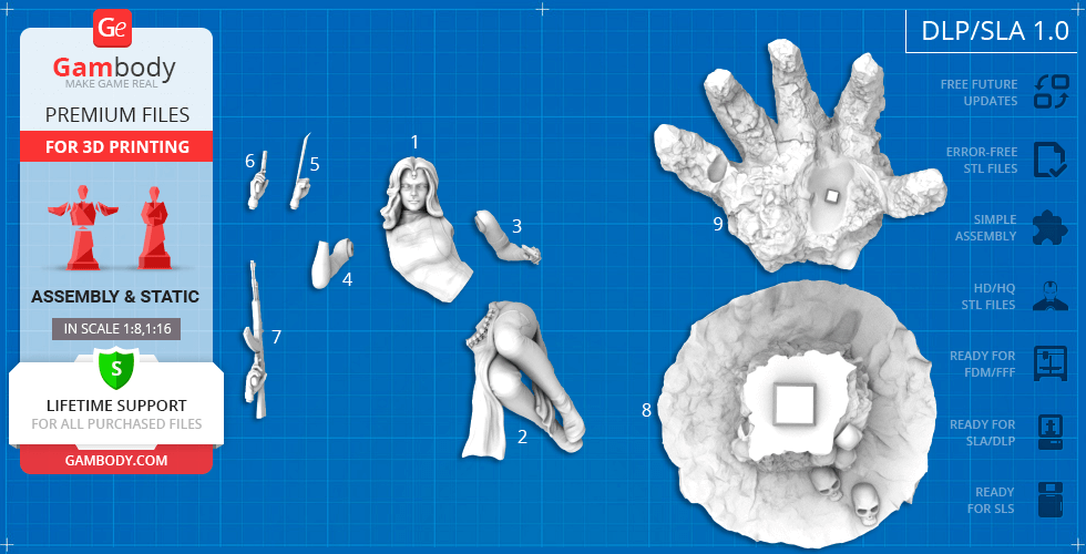 DLP/SLA 1.0 version features:- Contains 9 parts;- A printed model is 118 mm tall, 93 mm wide, 89 mm deep;- Three variants of the right hand are available, each holding a different weapon;- Made with a platform to resemble a hand-like stone throne;- All parts are divided in such a way to fit the build plates and to ensure that support structures are generated where needed.