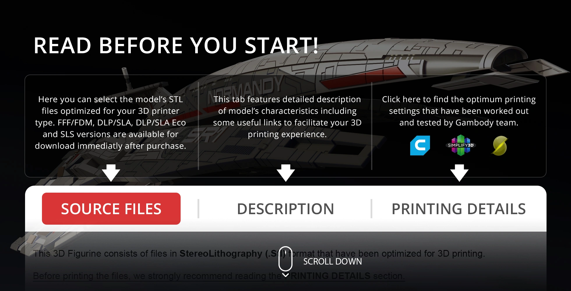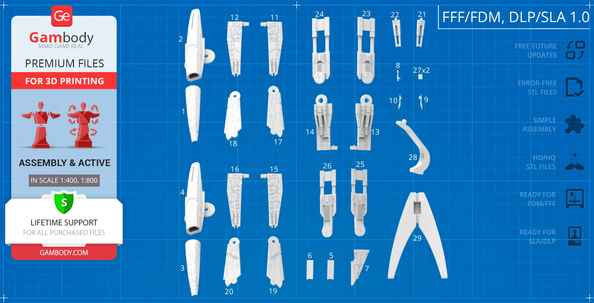 All assembly parts in the FFF/FDM 1.0 version are provided in STL files in recommended positions that were worked out in order to ensure the smoothness of the details’ surfaces after printing and that the 3D printing beginners won’t face difficulties when placing the parts on a build plate. When downloading any model’s file you will also receive “Assembly Manual” for FFF/FDM 1.0 and DLP/SLA 1.0 versions in PDF and video formats. We highly recommend that you get acquainted with the “Assembly Video” and “Assembly Manual” before getting down to the Normandy SR-1 3D printing model.
