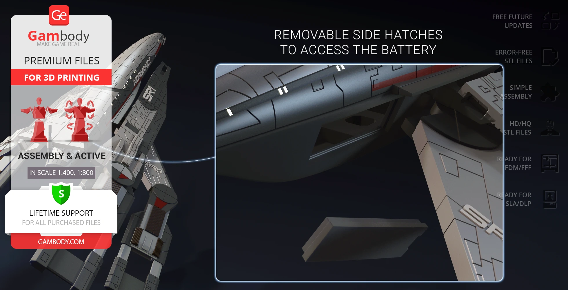 For you to receive the cleanest 3D printing result possible, minimize the amount of filament needed for generated support, and make use of the active elements designed by Gambody Engineers, the starship was divided into convenient assembly parts.