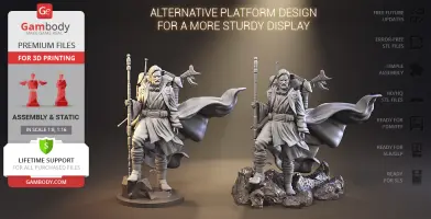 A solid Obi-Wan model with and without the lightsaber, with and without the platform. The assembly parts are connected using specially designed integrated connectors that fit securely into the corresponding slots. Optionally, for added strength and rigidity, the static connections can be glued together;