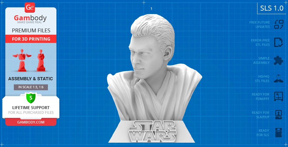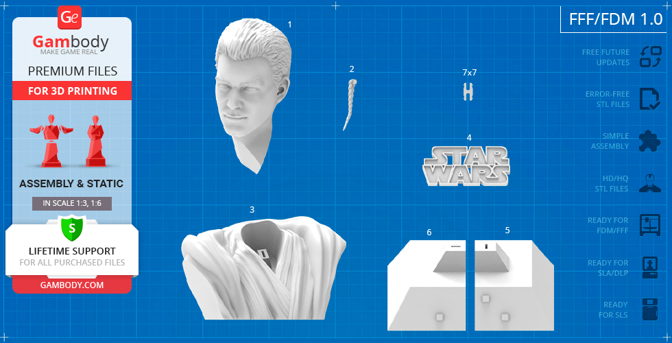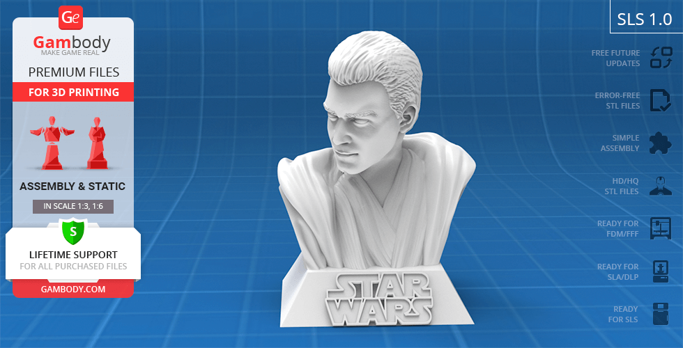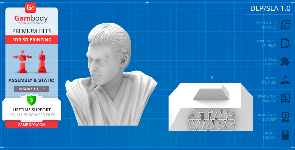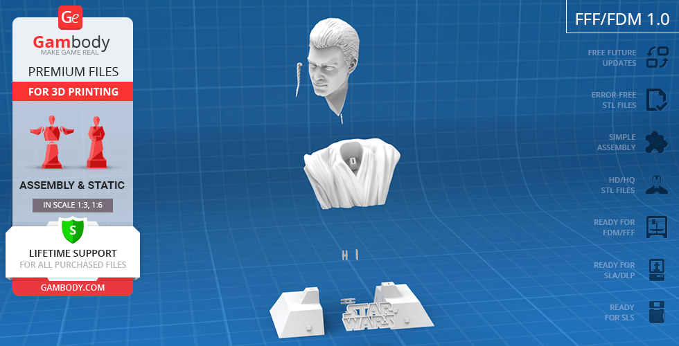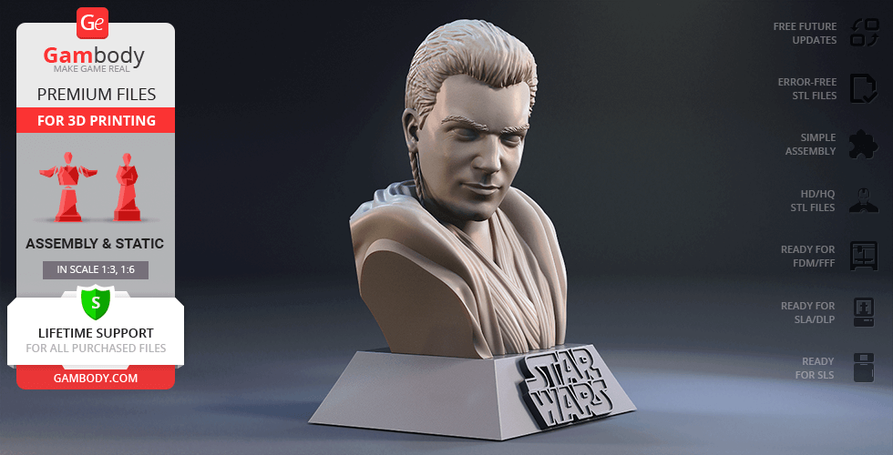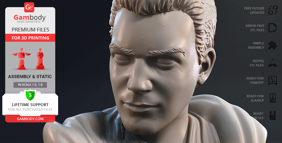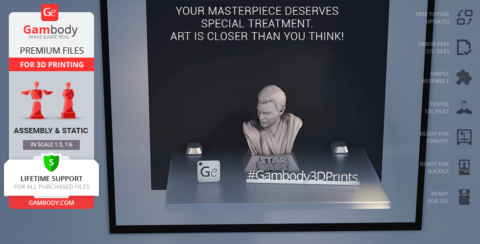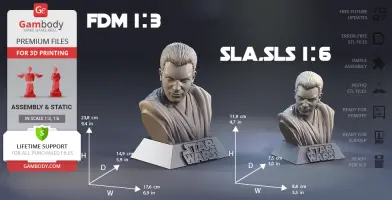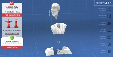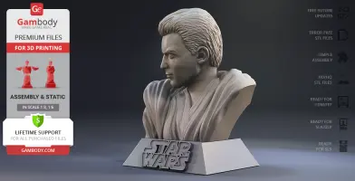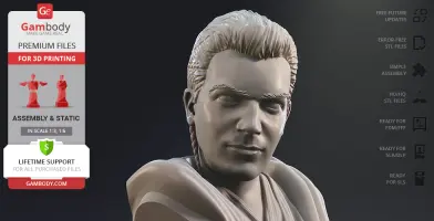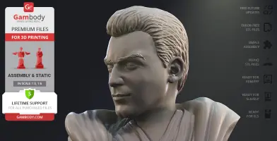 Obi-Wan Kenobi Bust is a static assembly figurine and its moderation and adaptation for different types of 3D printers took Gambody team 24 hours in total. The bust for 3D printing in its assembly version was divided into as many assembly parts as needed to fit even the smallest 3D printers' build plates and for you to preserve the figurine's aesthetic qualities after assembly.