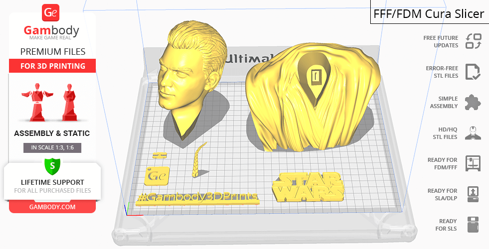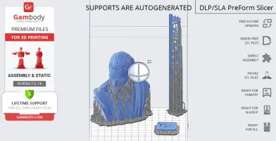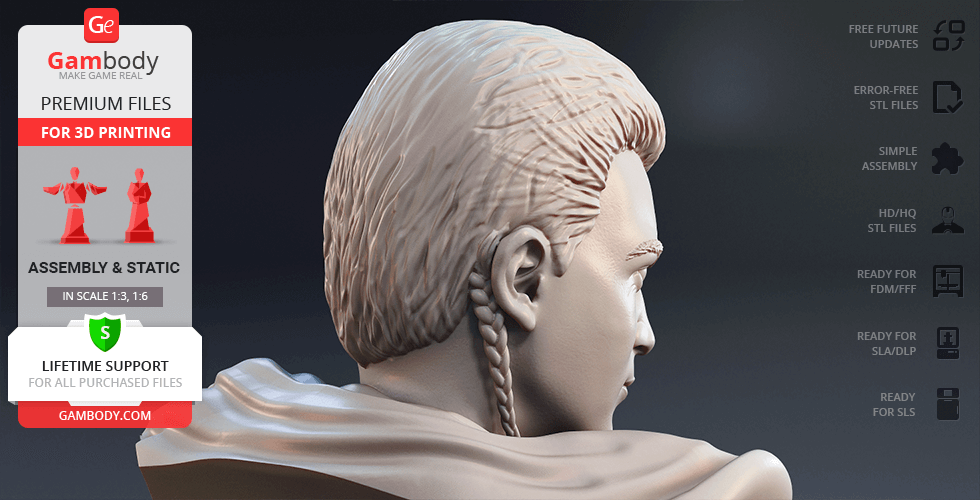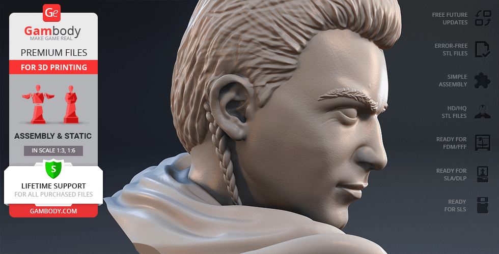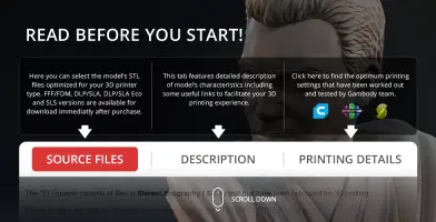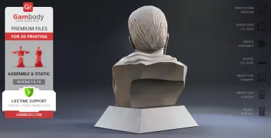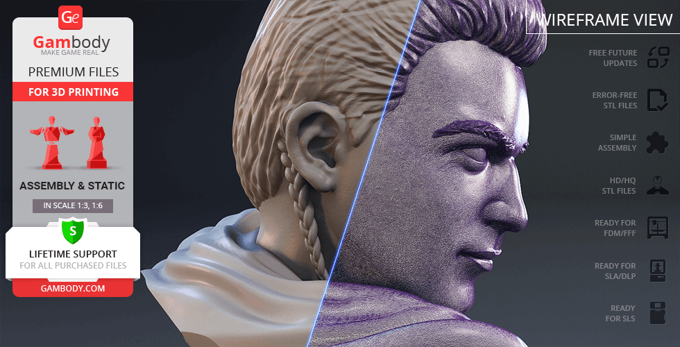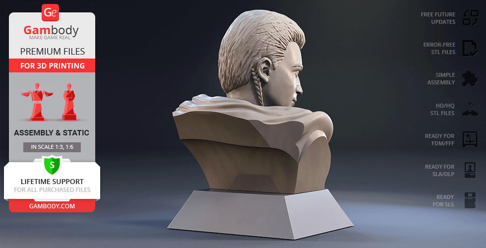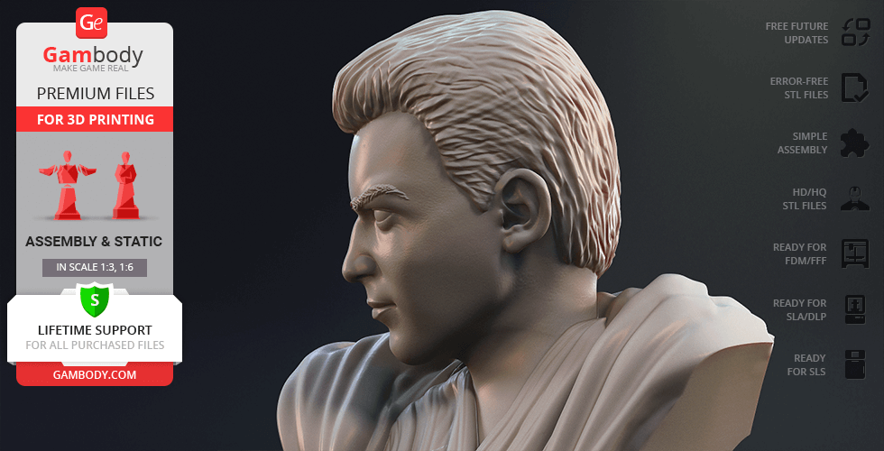 All assembly parts are provided in STL files of FFF/FDM version in recommended positions that were worked out to ensure the smoothness of the details’ surfaces after printing and that the 3D printing beginners won't face difficulties placing the parts on a build plate and supporting them. When downloading any bust’s file, you will also receive the "Assembly Manual" for FFF/FDM 1.0 in PDF format.