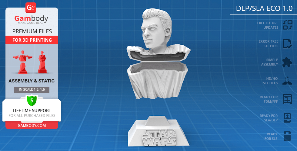 - 4 versions of Obi-Wan Kenobi Bust 3D print files for FFF/FDM, DLP/SLA, DLP/SLA Eco, and SLS - files for each version are available for download after the purchase