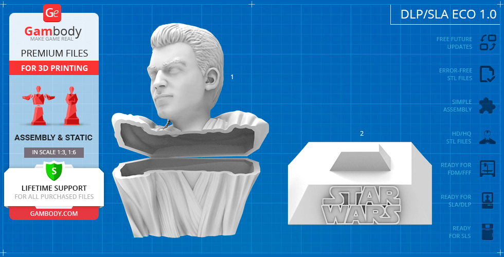 The cutting of the Obi-Wan Kenobi bust was chosen by our team to minimise the amount of filament needed for generated support and some of the model’s parts were hollowed out for you to save resin in the model’s Eco version. In order to ensure the cleanest 3D printed result, Obi-Wan Kenobi’s head was separated from the body; the Padawan braid, platform and the Star Wars lettering were provided as separate assembly parts.