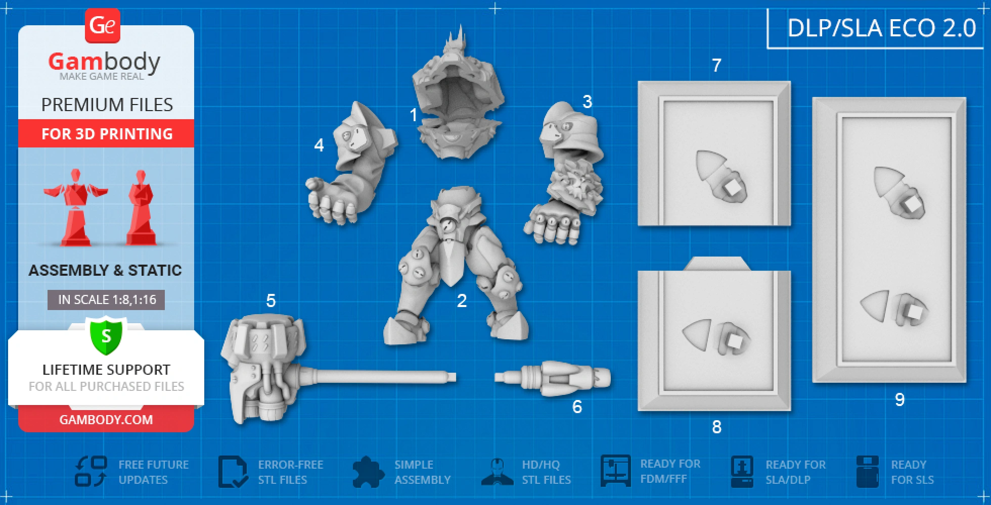 - STL files of Reinhardt 3D Model for 3D printing which consist of 52 parts;- 5 versions of files for this model for FFF/FDM, DLP/SLA, and SLS;- High-poly detailed figurine of Reinhardt;- Detailed settings that we provide for Cura , Simplify3D and Slic3r for the best print;- Full technical support from the Gambody Support Team.