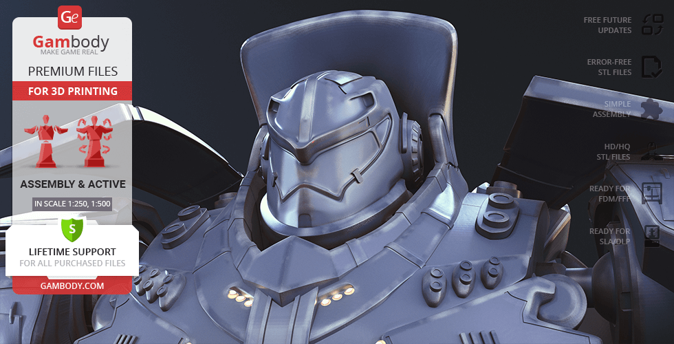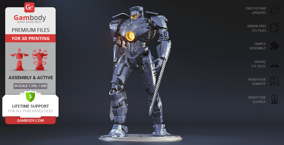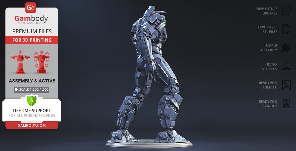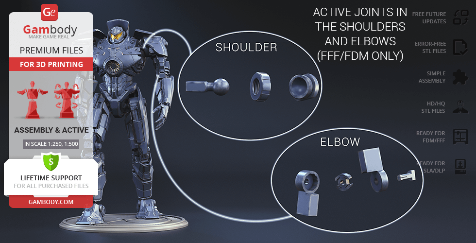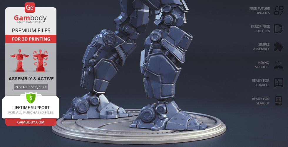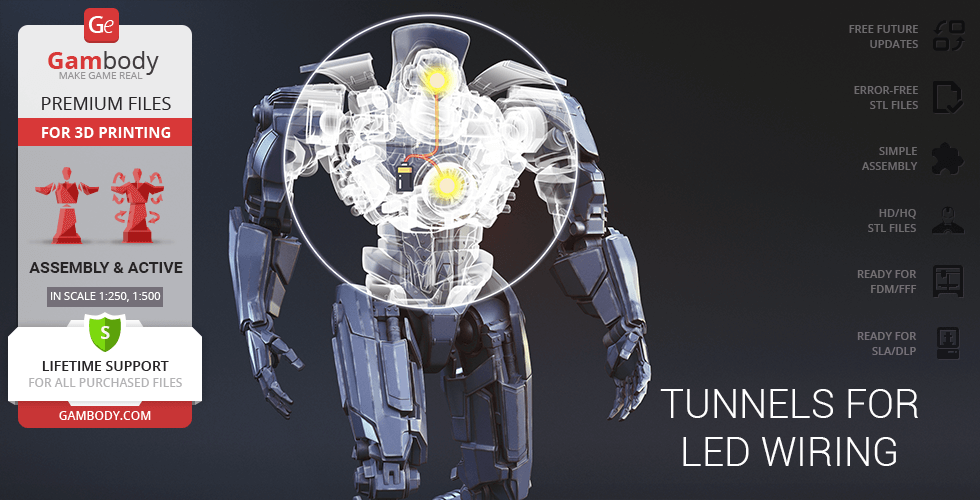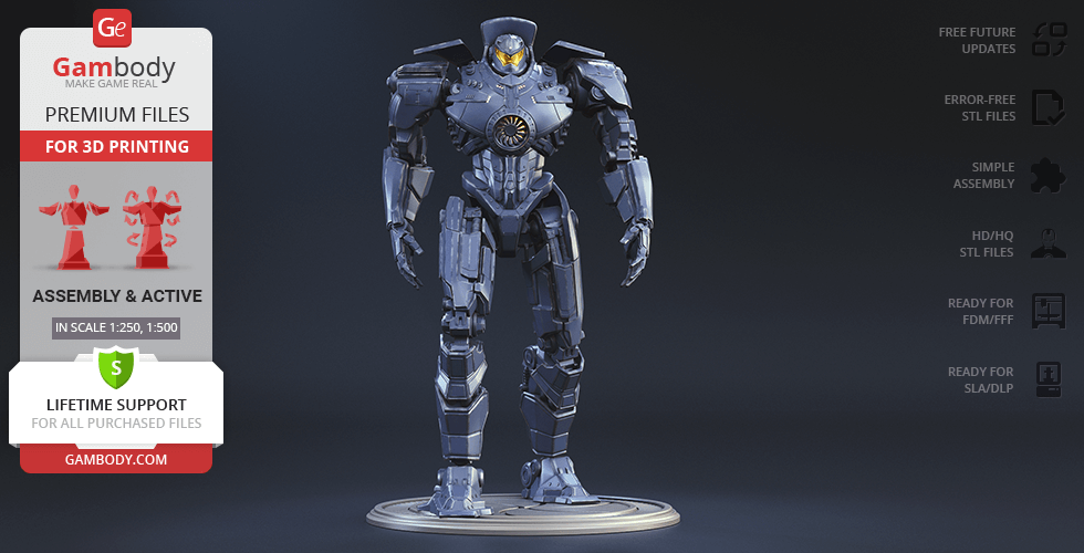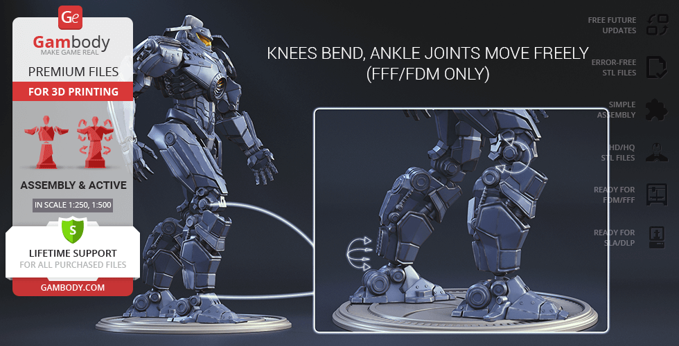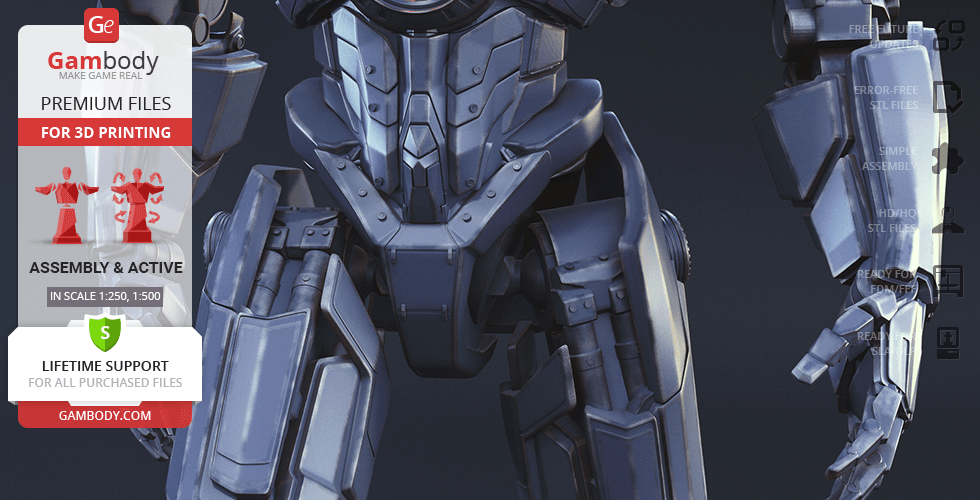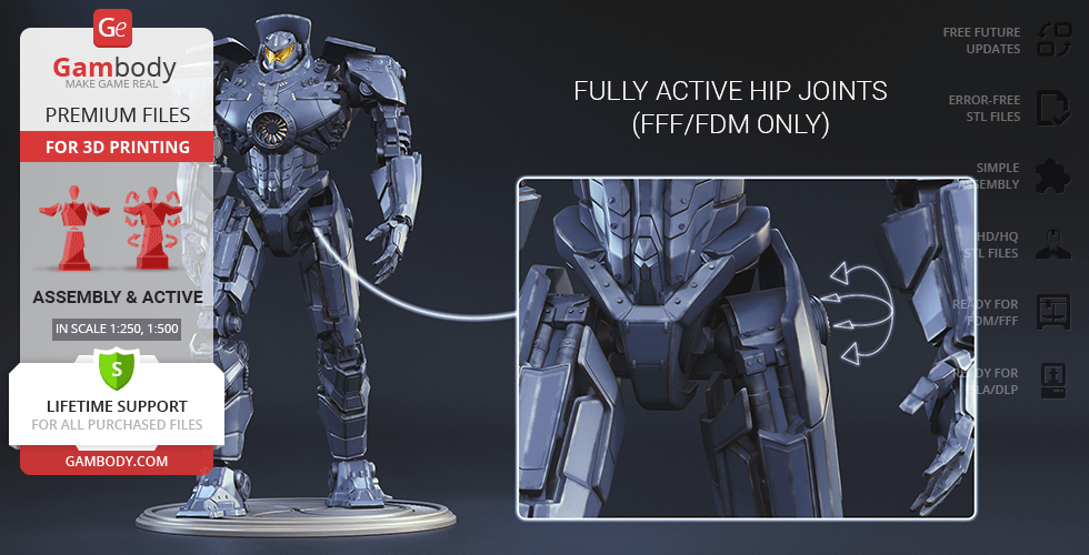 Gipsy Danger for 3D printing is a fully active assembly model and its moderation and adaptation for different types of 3D printers took the Gambody team 51 hours in total.