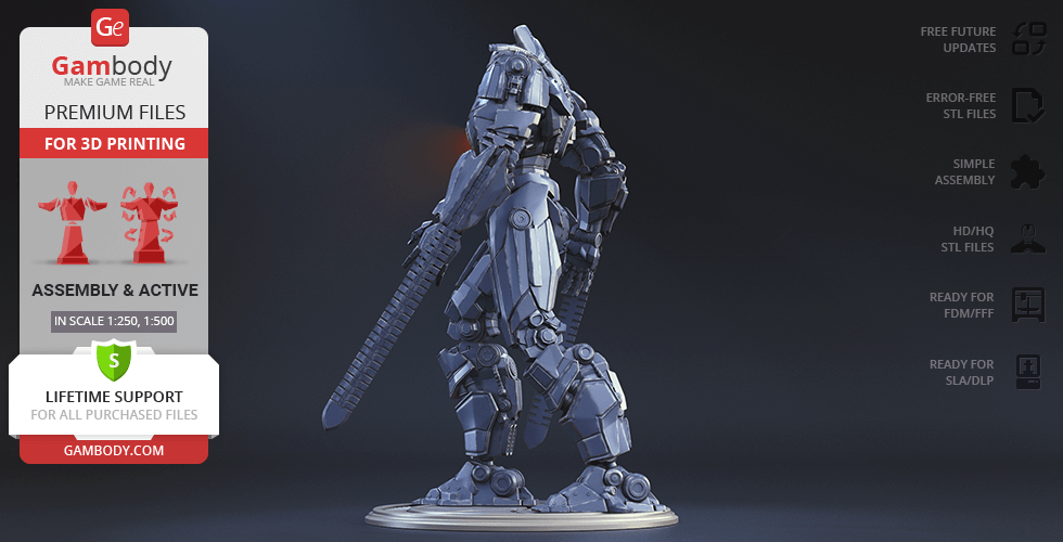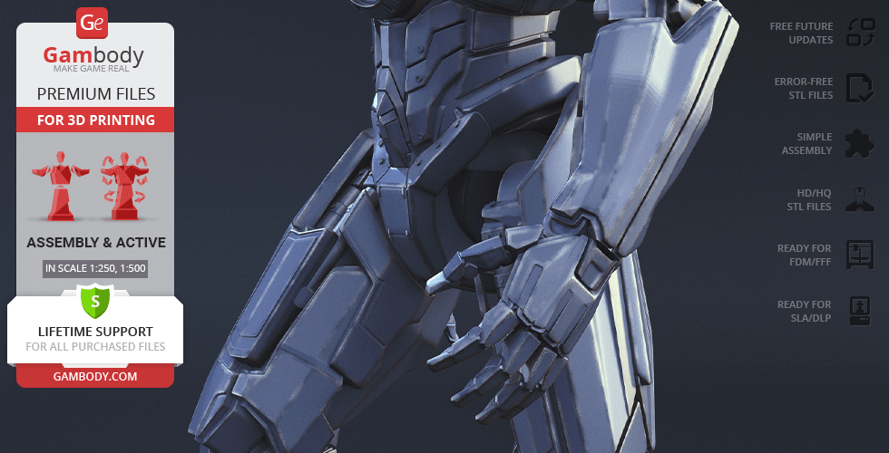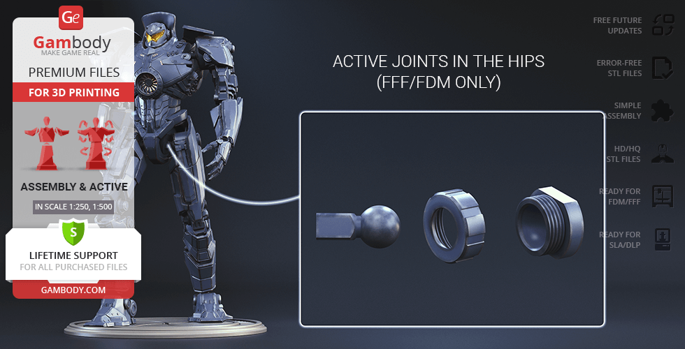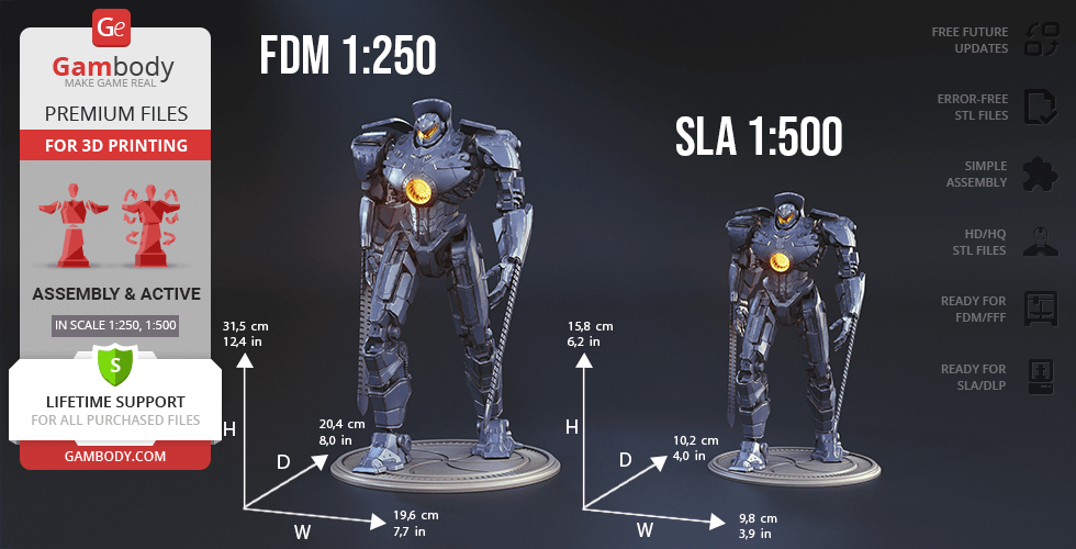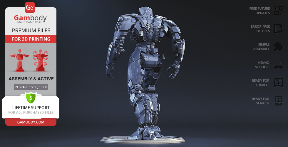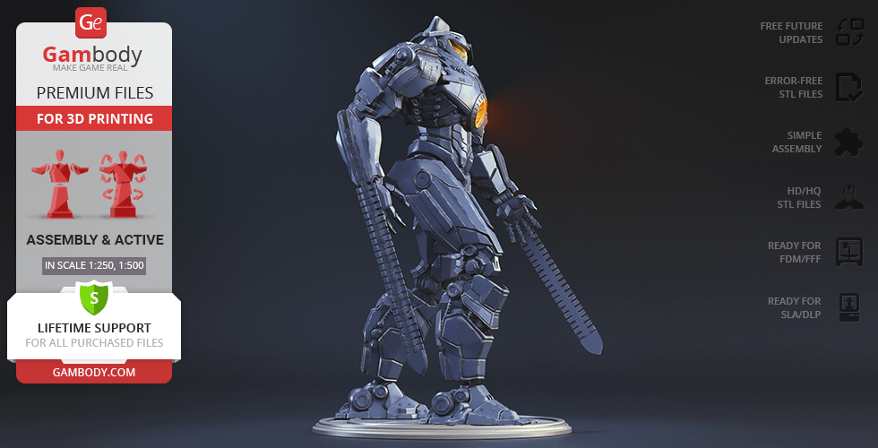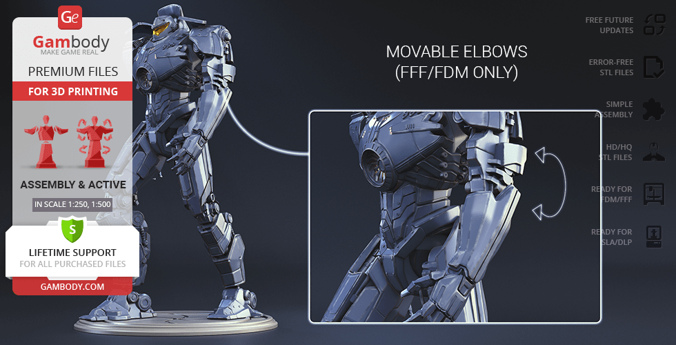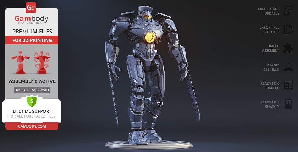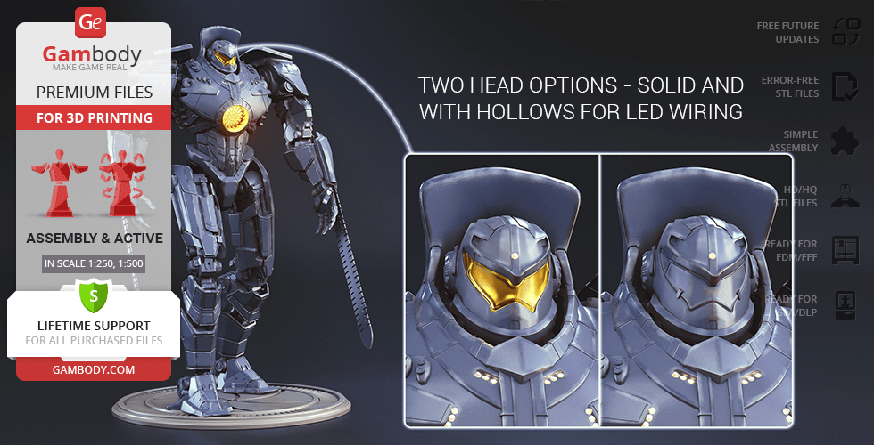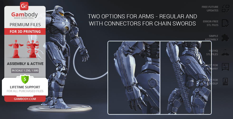 The new, updated version of Gipsy Danger will definitely get your praise! The model is presented in new scales, 1:250 in FFF/FDM and 1:500 in DLP/SLA. The better, high-poly design of Gipsy Danger ensures very detailed, intricate printing results. The hollowed parts of the model give the option to illuminate the Jeager using LED lights. Another stunning detail is the chain swords, which indeed make the mobile weapon so “danger”. The articulation of the new 2.0 version is provided by new, more secure, and durable joints. Be the first to enjoy the Gipsy Danger at completely higher level!