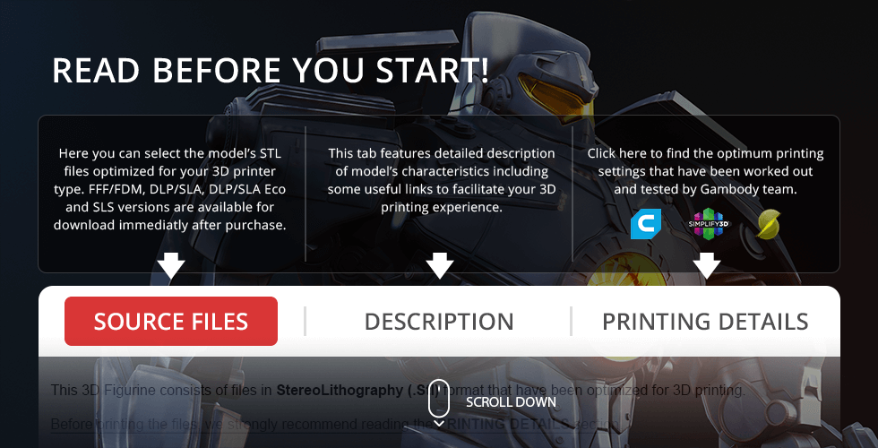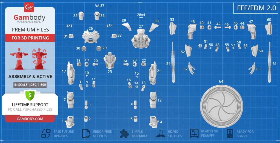 All assembly parts in the FFF/FDM 2.0 version are provided in STL files in recommended positions that were worked out in order to ensure the smoothness of the details’ surfaces after printing and that the 3D printing beginners won’t face difficulties when placing the parts on a build plate. When downloading any model’s file you will also receive “Assembly Manual” for FFF/FDM 2.0 and DLP/SLA 1.0 versions in PDF format. We highly recommend that you get acquainted with the “Assembly Video” and “Assembly Manual” before getting down to the Gipsy Danger model.