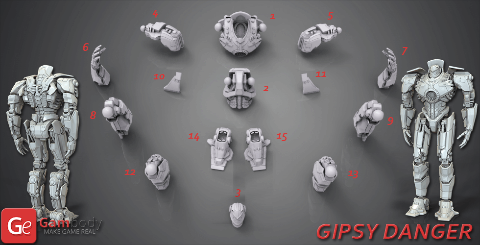 - STL files of high-poly Pacific Rim Jaeger Gipsy Danger 3D Model for 3D printing consist of 109 files;