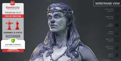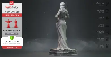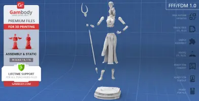 Persephone figurine for 3D printing is a static assembly model and its moderation and adaptation for different types of 3D printers took Gambody team 46 hours in total. Figurine’s anatomy was thoroughly reviewed during the moderation process for the beautiful goddess to be depicted harmoniously in the intended pose. The model’s cutting was chosen by our team to minimise the amount of filament needed for generated support and some of the parts were hollowed out for you to save resin in the figurine’s Eco version. For you to receive the cleanest result possible the bident that Kore is holding was extracted from the hand and divided into three separate parts. In order to conceal the places where the assembly parts of the model must be connected, the figurine was cut along the contour of the goddess’ clothes and accessories seams. What is more, in order to ensure an excellent quality of the 3D printed result, such finer parts as Persephone’s hair, her gladiator sandals, skull-like ferrule or the head of the bident are provided as separate parts as well. All the assembly parts come in STL files in recommended positions that were worked out in order to ensure the smoothness of the details’ surfaces after printing and so that the 3D printing beginners won't face difficulties when placing the parts on a build plate.