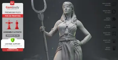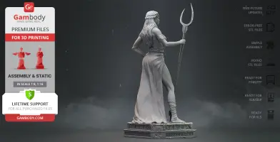 Persephone, also known as Kore or Proserpina, was the daughter Zeus and the goddess of vegetation, spring and agriculture in Greek mythology. According to the myth, Persephone was abducted by Hades, the God-King of the Underworld and soon was forced to become his Queen. Since then she was obliged to spend a third of each year (the winter months) in the Underworld, and the remaining part of the year she could rule with the Gods above, on earth. The 3D artist spent 162 hours on the project and paid meticulous attention to every little detail that the beautiful goddess figurine comprises. Persephone for 3D printing is depicted stately and powerful, with her posture majestic and her stare confident. The lady’s thick hair is shown descending in soft curls and her clothes definitely look like something easily associated with Greek gods. Gladiator sandals, snake armband, elegant jewellery and accessories - the author of the 3D printing model made sure this Persephone will be interesting to print, paint and simply look at. As it befits the Queen of the Underworld, 3D printing Persephone figurine holds a bident, a weapon commonly associated with Hades. Her bident has two pointed prongs and a sharp ferrule that is plunged into a skull. Finally, the goddess of agriculture is depicted standing on a platform that once again reminds us of her husband’s origin. The base is adorned with Underworld-related symbols, skulls, Greek meander and even human skeleton hands. We are sure that with such a spectacular appearance a 3D printing Queen of the Underworld will look fantastic among your collection!