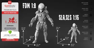 Scale: Predator height is 2220 mm. The scale of this model made in proportion to it. 1/8 for FFF/FDM 1.0 version and 1/16 for DLP/SLA 1.0 and SLS 1.0 versions.