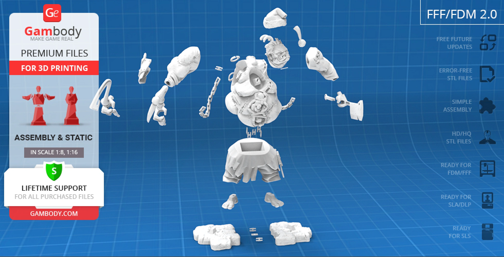 - The model is available in recommended scales of 1:8 for the FFF/FDM version and 1:16 for the DLP/SLA/SLS versions, based on approximate height of Pudge (1800 mm).