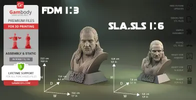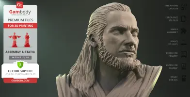 Qui-Gon Jinn Bust is a static assembly figurine and its moderation and adaptation for different types of 3D printers took Gambody team 25 hours in total. The bust for 3D printing in its assembly version was divided into as many assembly parts as needed to fit even the smallest 3D printers' build plates and for you to receive a neat finished piece after assembly.