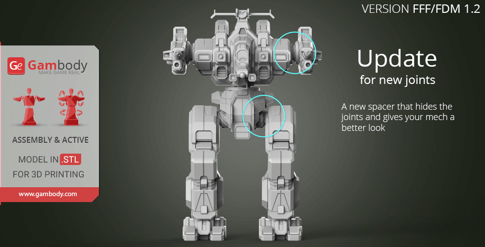 Now is added a new spacer that hides the joints and gives your Mech a better look. The body and the pelvis were also slightly altered in this version. STL files are already available for download in the tab “Source Files”, version FFF/FDM 1.2. The names of the files: