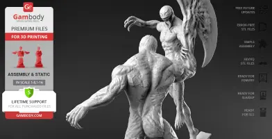 A solid Riot Symbiote 3D model and two variants of the platform. A new cutting and enhanced level of detail. The model is significantly improved in accordance with anatomy and body proportions rules. The assembly parts are connected using specially designed integrated connectors that fit securely into the corresponding slots. Optionally, for added strength and rigidity, the static connections can be glued together;