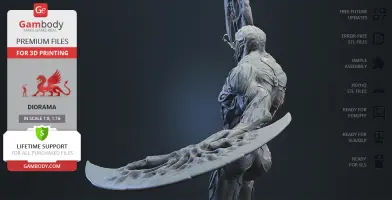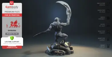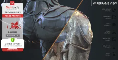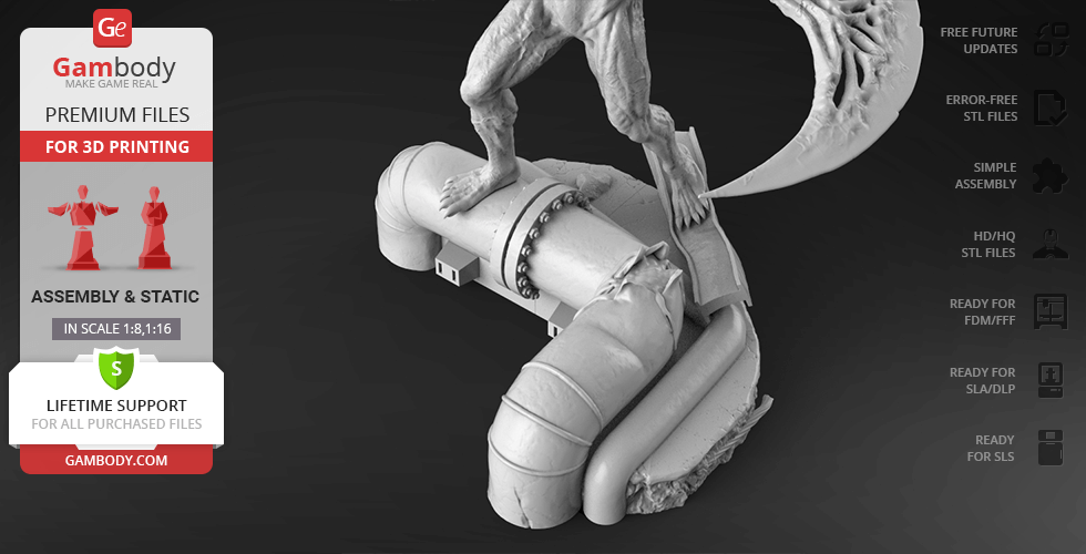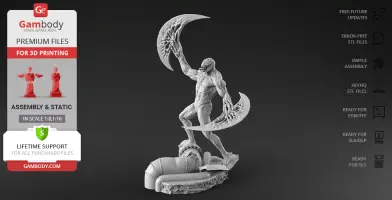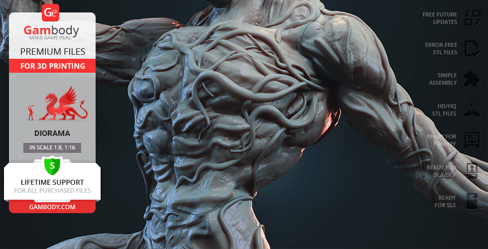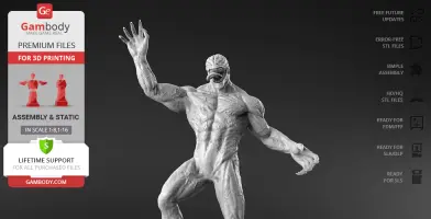 Some parts are hollowed out to save resin. A new cutting and enhanced level of detail. The model is significantly improved in accordance with anatomy and body proportions rules. The assembly parts are connected using specially designed integrated connectors that fit securely into the corresponding slots. Optionally, for added strength and rigidity, the static connections can be glued together;