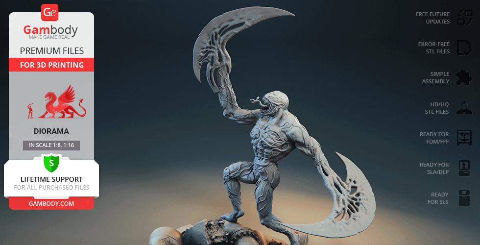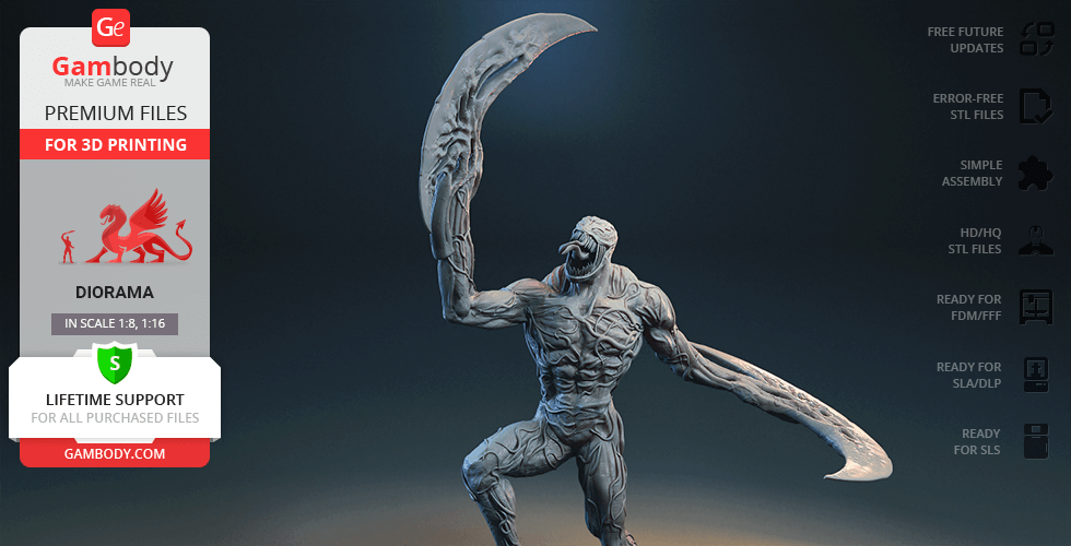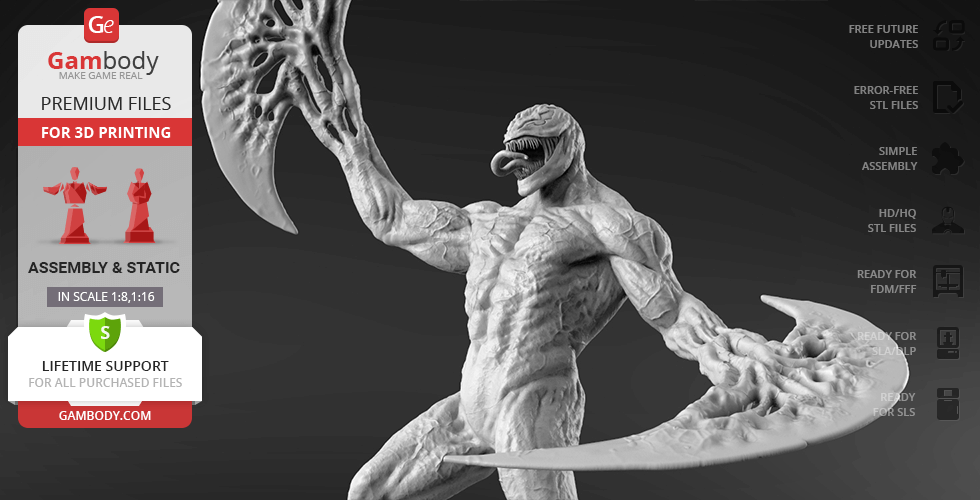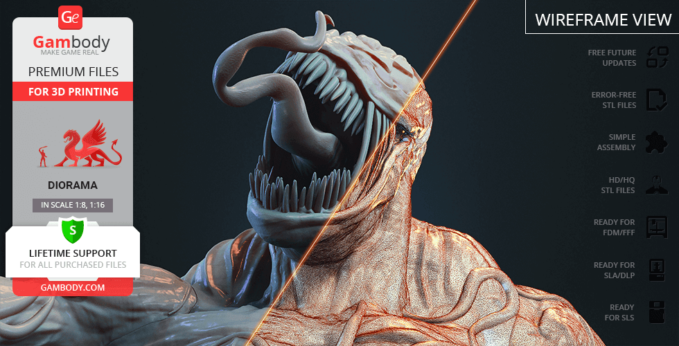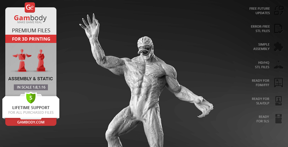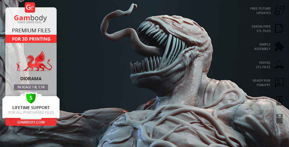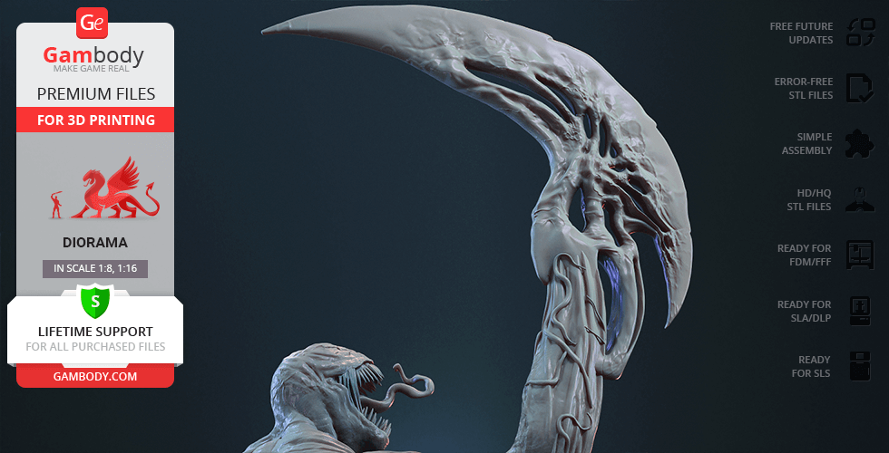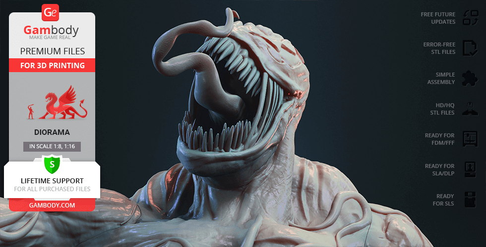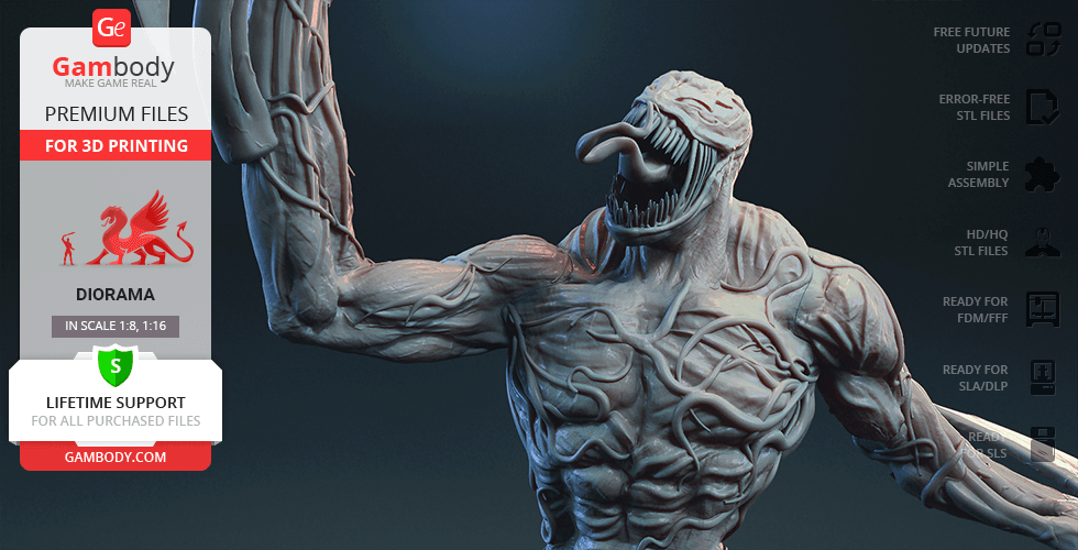 - The model is available in recommended scales of 1:8 for the FFF/FDM version and 1:16 for the DLP/SLA/SLS versions, based on approximate height of Venom (1920 mm).