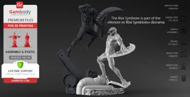 Watch the tutorial on how to assemble the 3D Printed Riot Symbiote in Diorama Model from the provided 3D Print Files at Gambody YouTube channel.