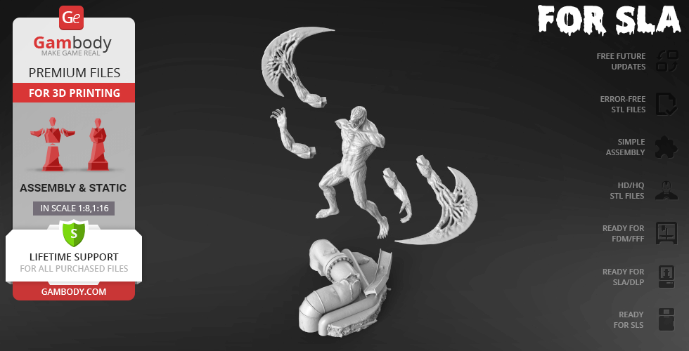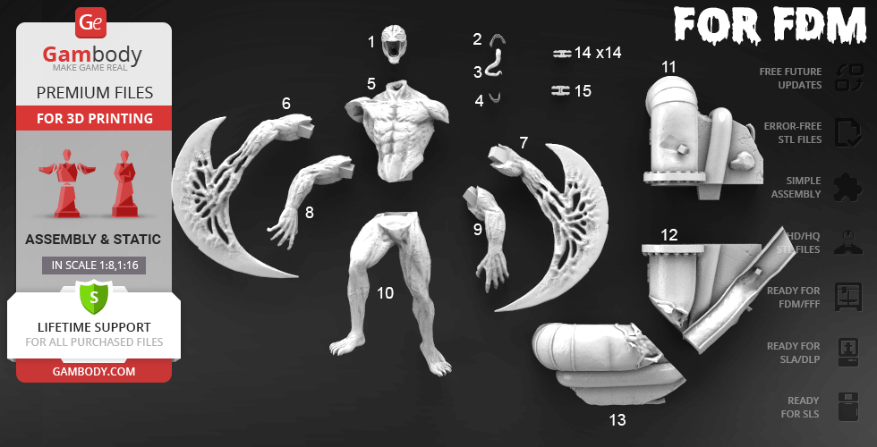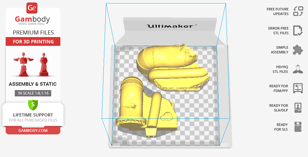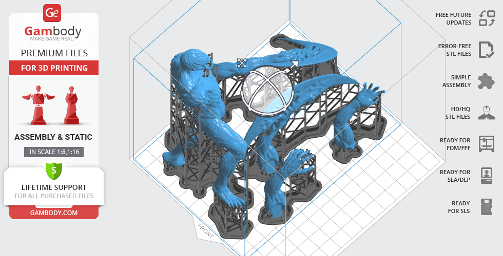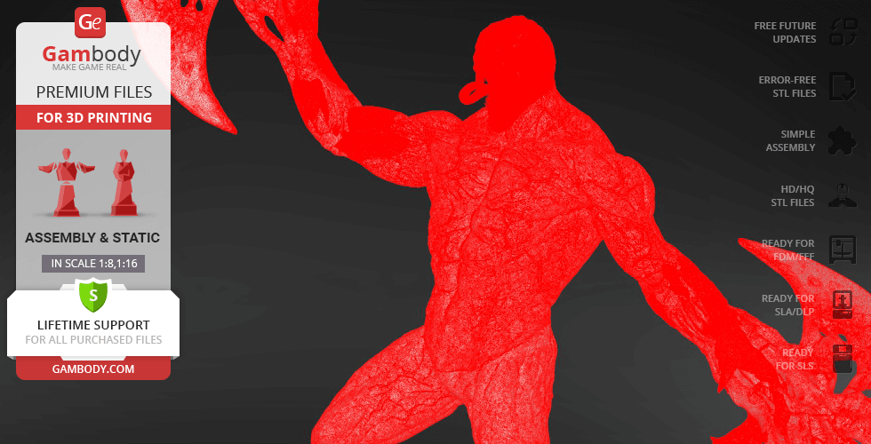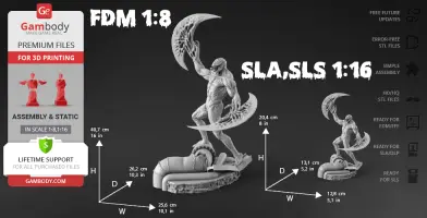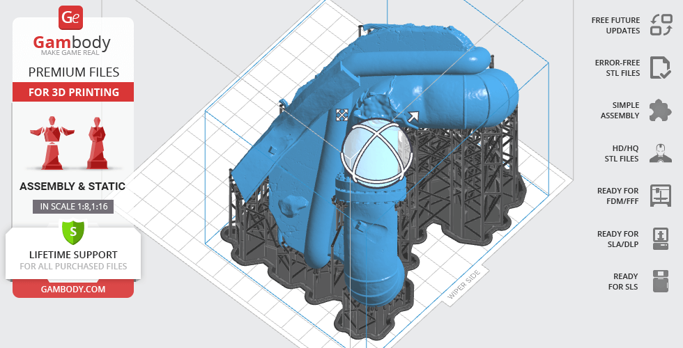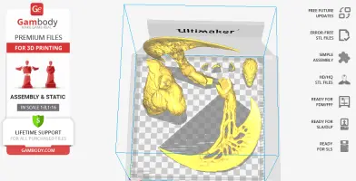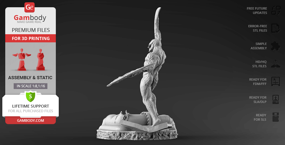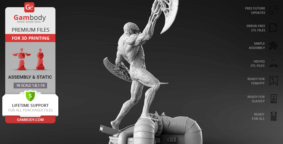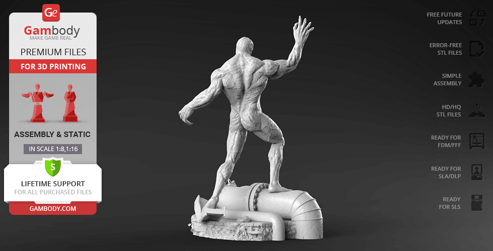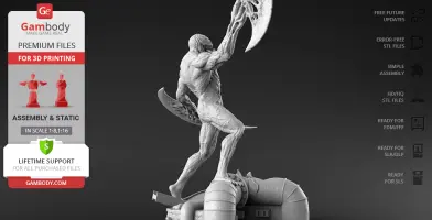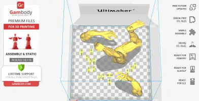 The STL files that this version comprises are pre-supported, hollowed out, and have drain holes where needed. You may choose to print the STL files one by one or several at once, depending on the dimensions of your resin 3D printer's build plate.When slicing several STL files at once, the attachment layers (Platform Touch Shape) may overlap, but the supports must not come into contact. A new cutting and enhanced level of detail. The model is significantly improved in accordance with anatomy and body proportions rules. The assembly parts are connected using specially designed integrated connectors that fit securely into the corresponding slots. Optionally, for added strength and rigidity, the static connections can be glued together;