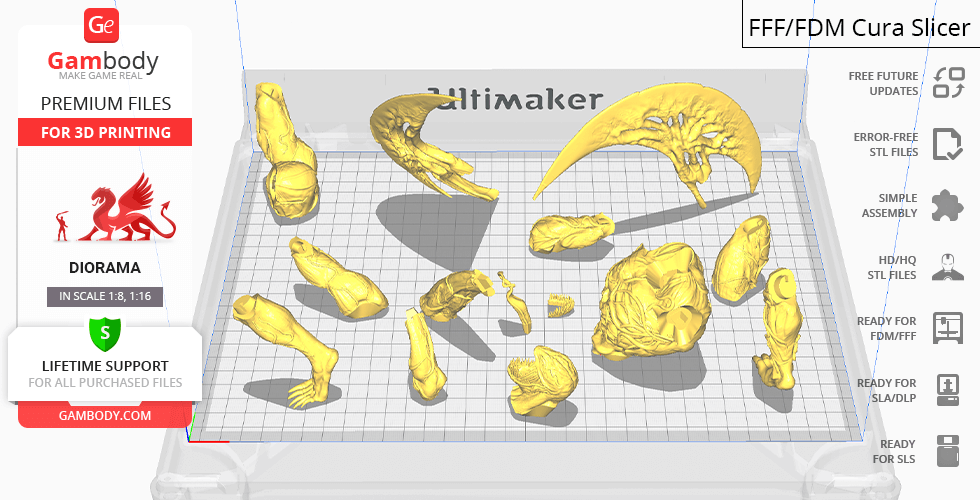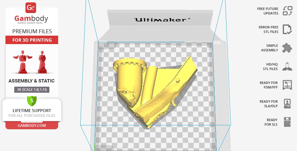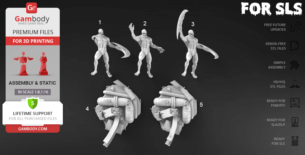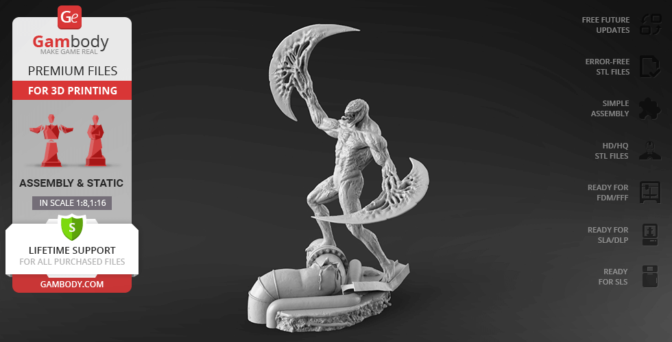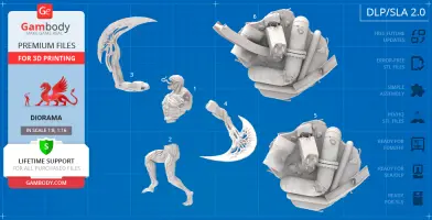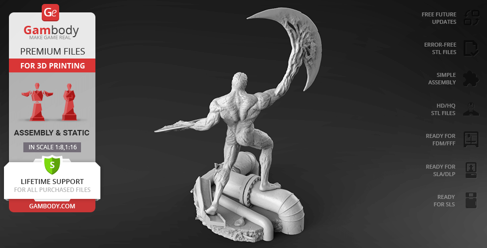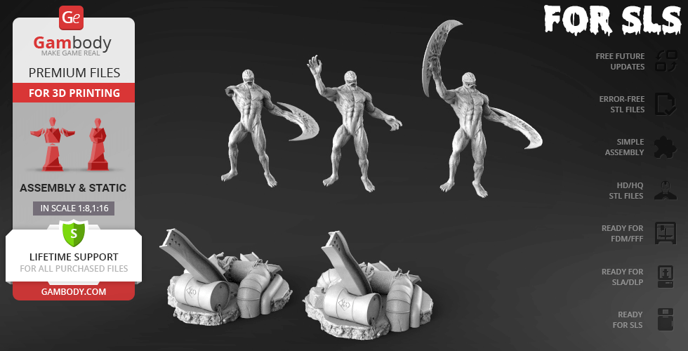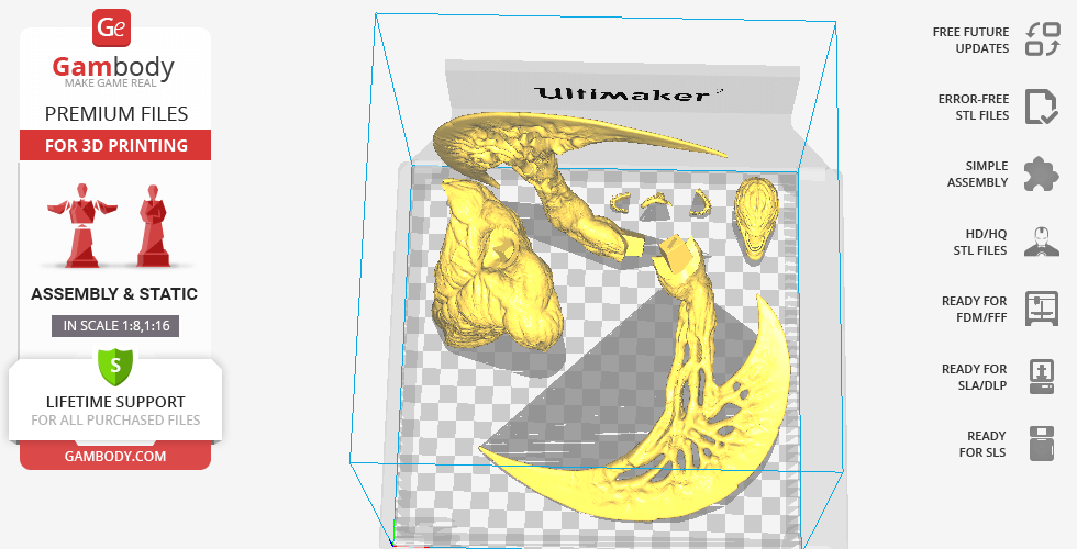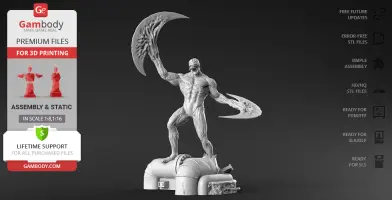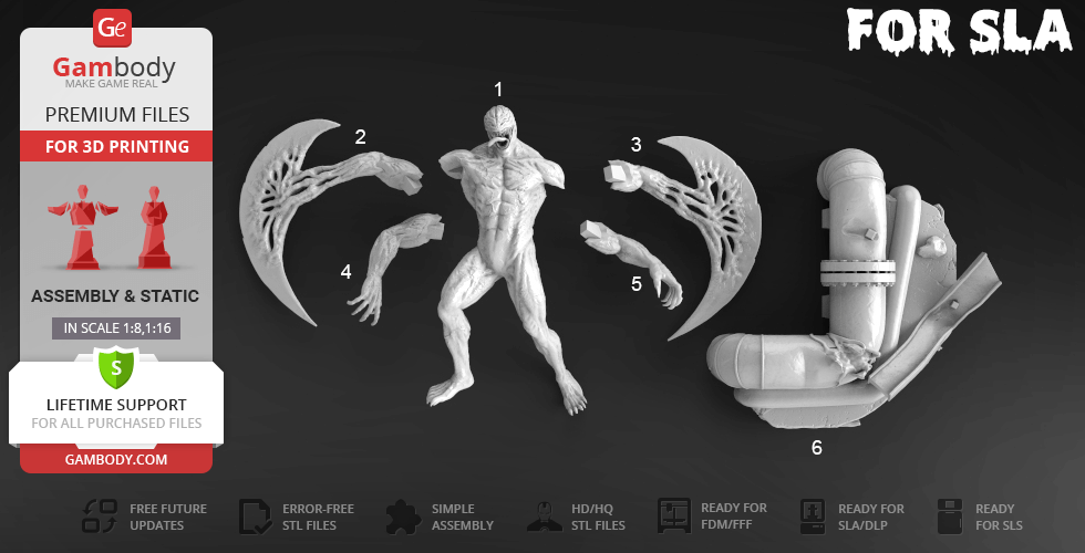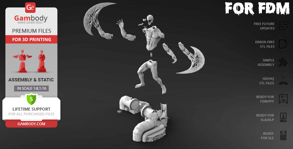 The STL files that this version comprises are pre-supported, hollowed out, and have drain holes where needed. You may choose to print the STL files one by one or several at once, depending on the dimensions of your resin 3D printer's build plate.When slicing several STL files at once, the attachment layers (Platform Touch Shape) may overlap, but the supports must not come into contact. A new cutting and enhanced level of detail. The model is significantly improved in accordance with anatomy and body proportions rules. The assembly parts are connected using specially designed integrated connectors that fit securely into the corresponding slots. Optionally, for added strength and rigidity, the static connections can be glued together;