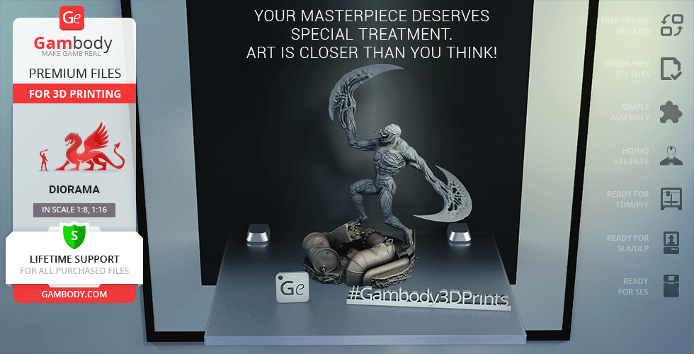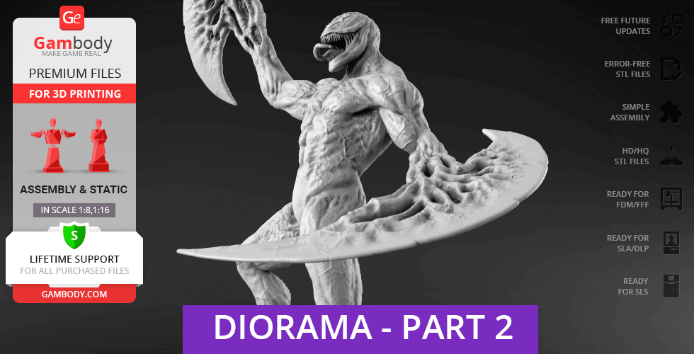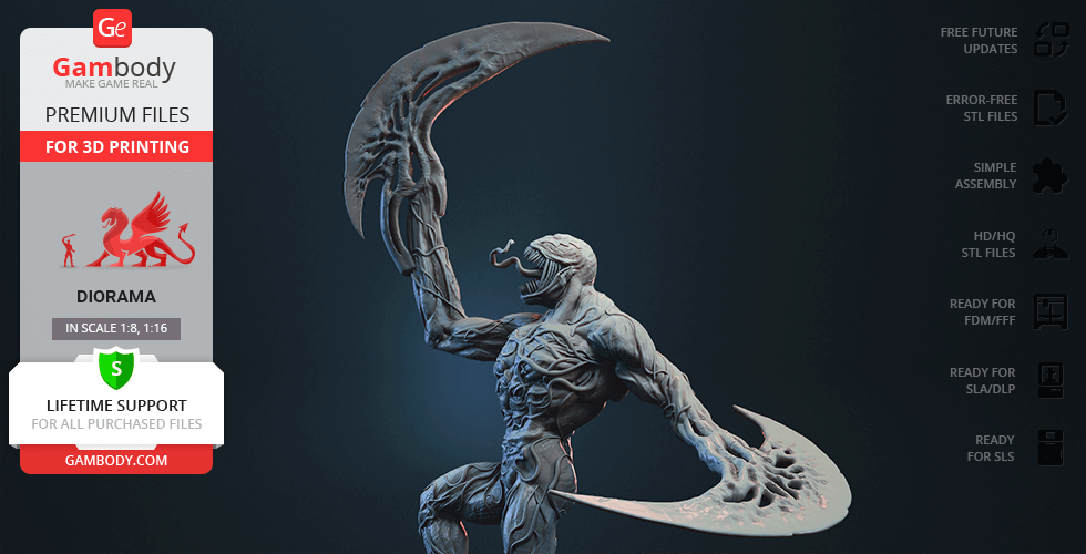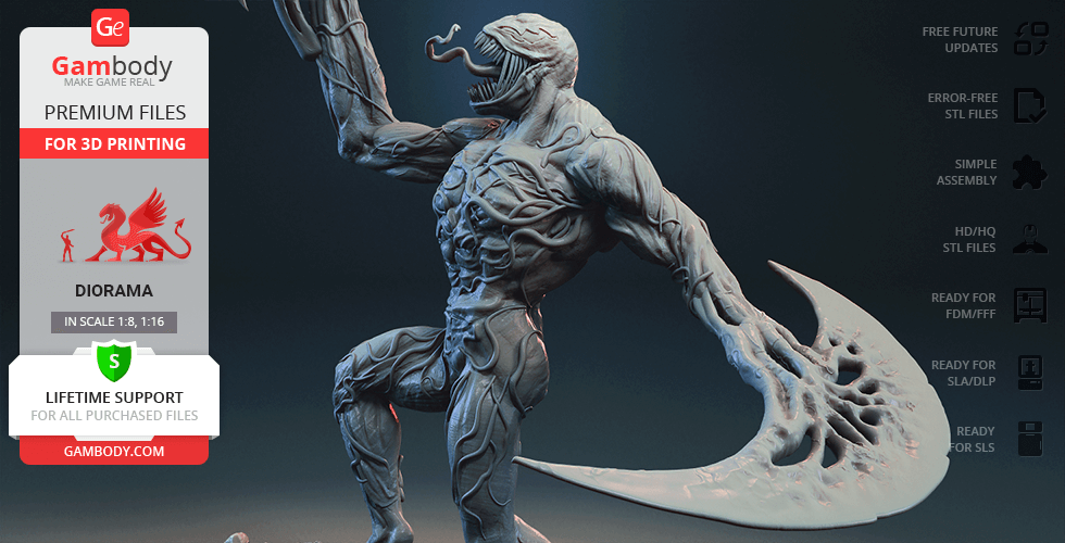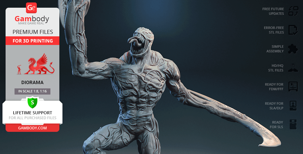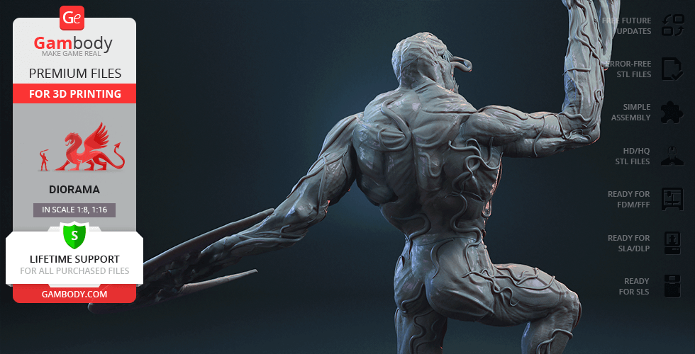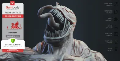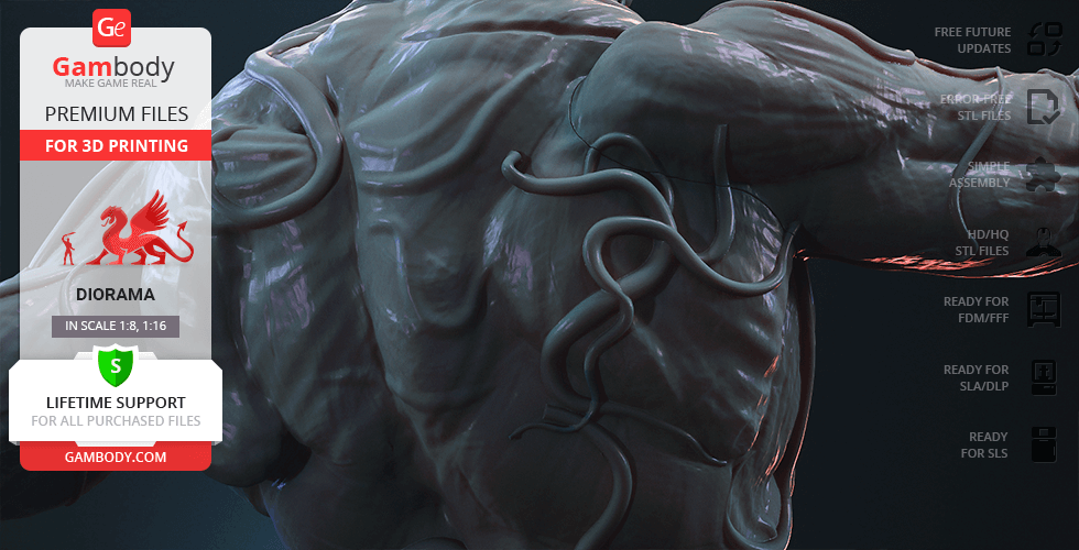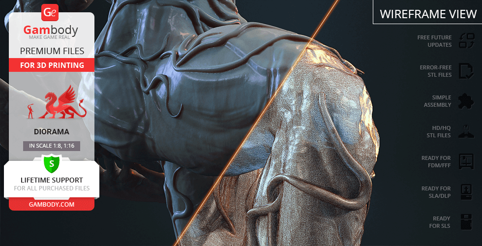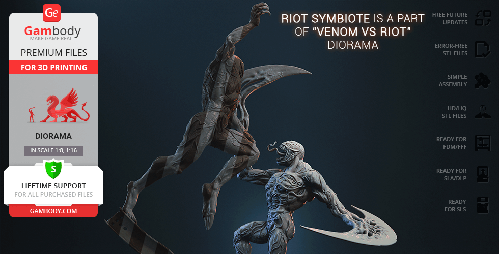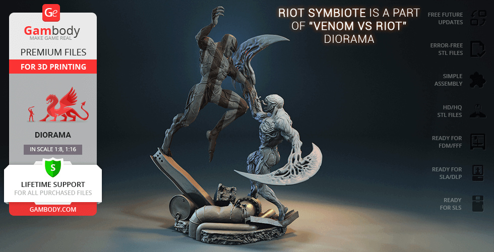 - 8 versions of Riot Symbiote in Diorama diorama STL files for FFF/FDM, DLP/SLA, DLP/SLA Eco, and SLS — files for all versions are available for download after the purchase;