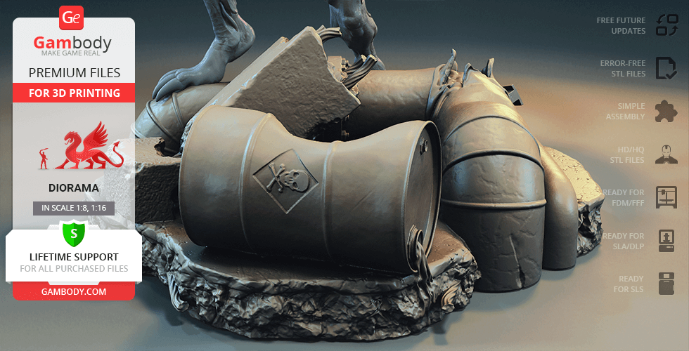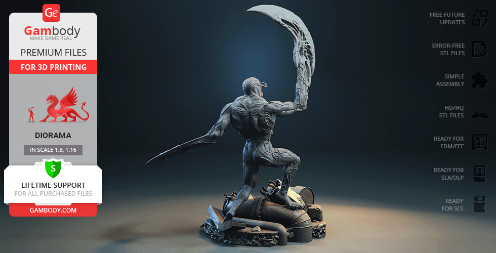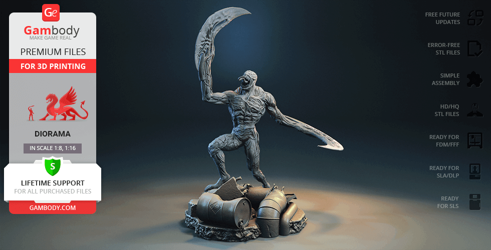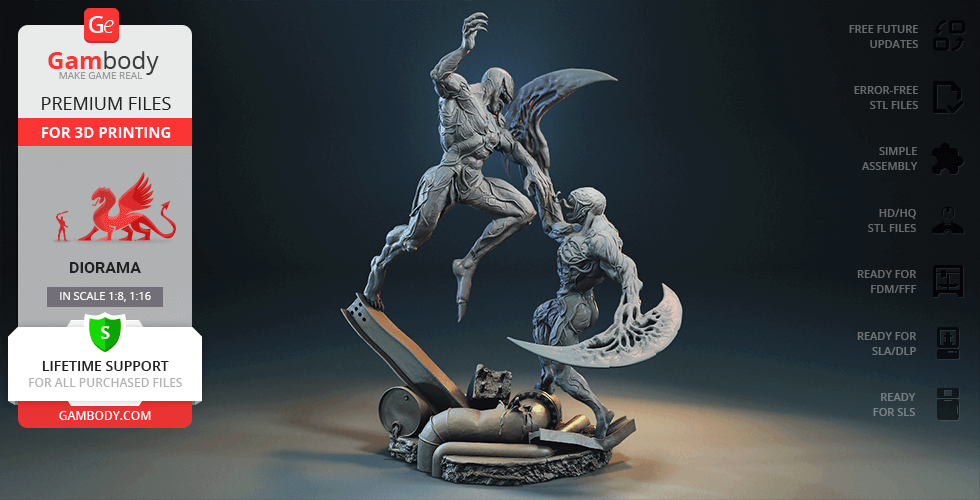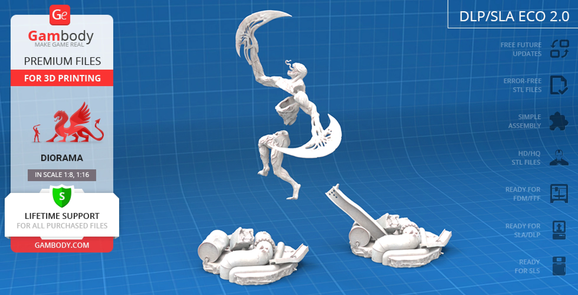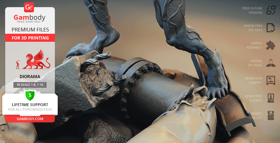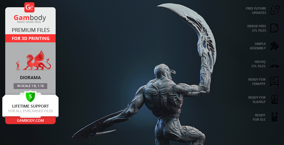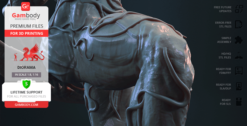 - 8 versions of Riot Symbiote in Diorama diorama STL files for FFF/FDM, DLP/SLA, DLP/SLA Eco, and SLS — files for all versions are available for download after the purchase;