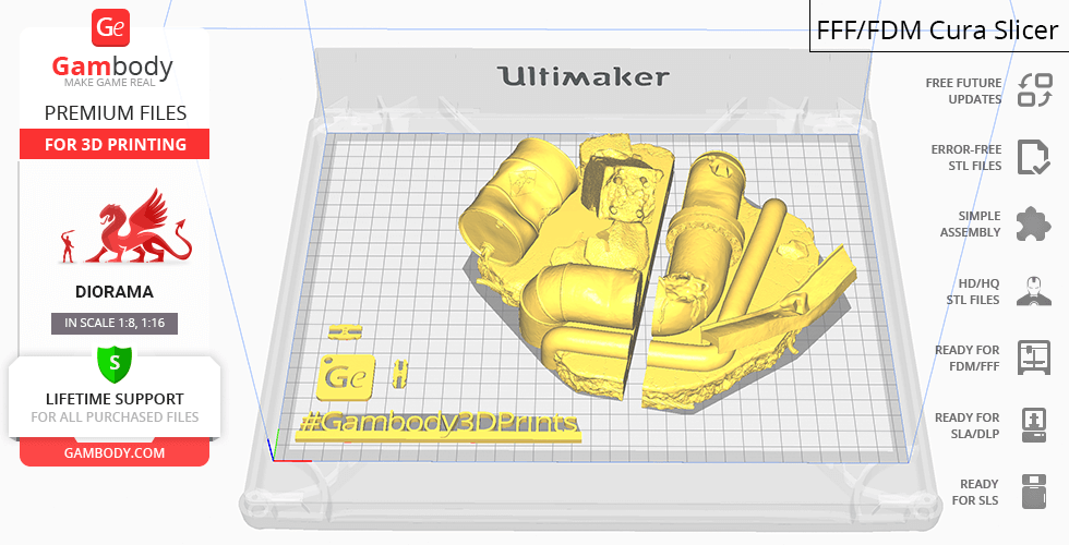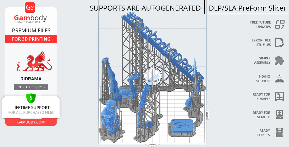 - Optimized part division minimizes support material and ensures smooth surface detail;