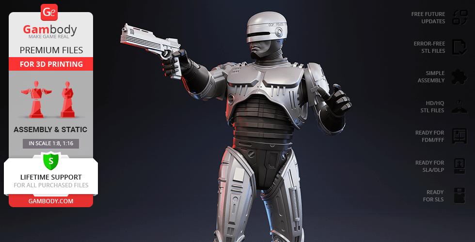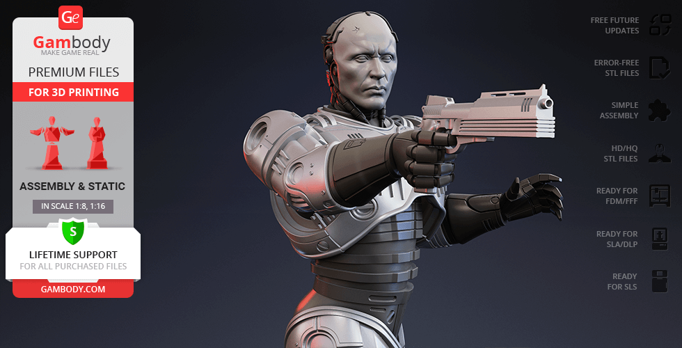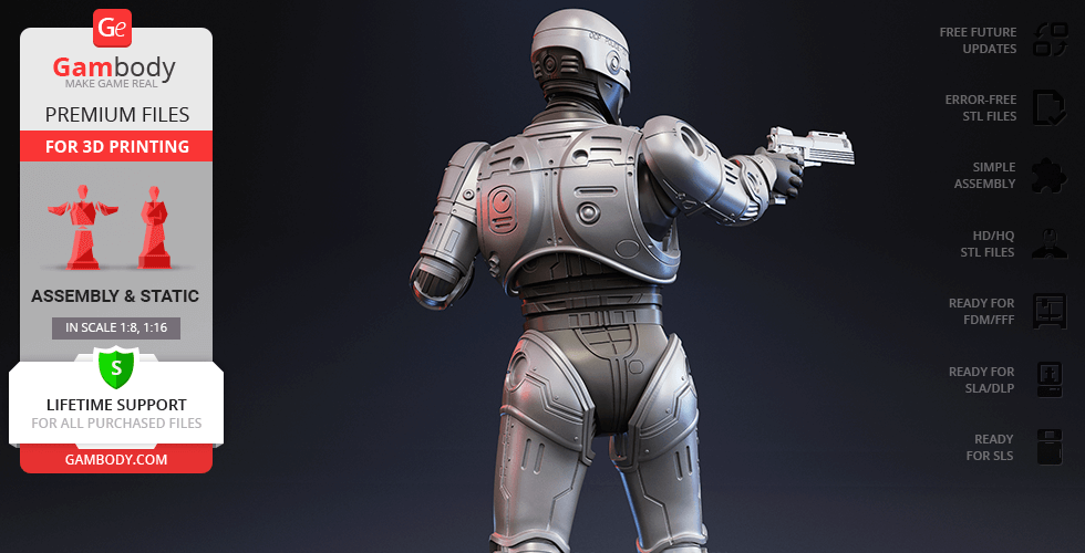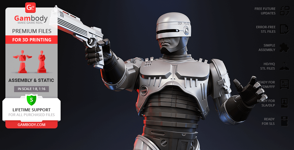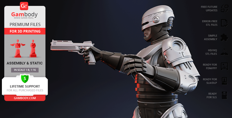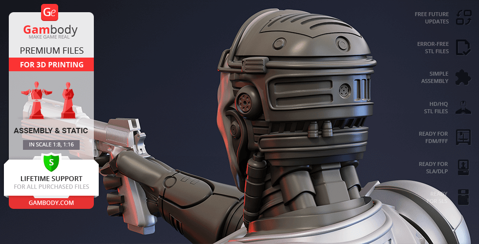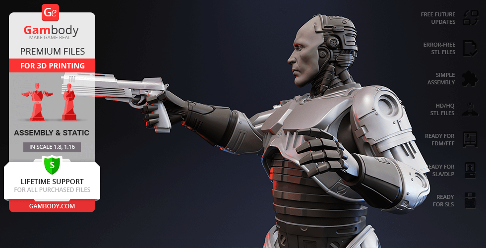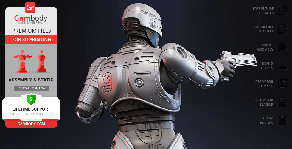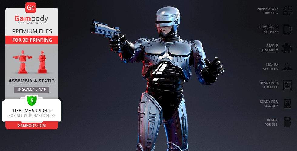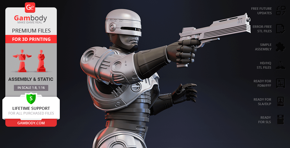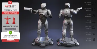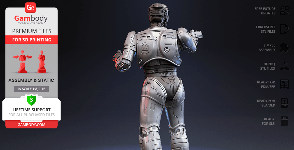RoboCop 1987 3D Printer Files | Assembly includes 3 version(s) for the supported 3D printer type(s): FFF/FDM, DLP/SLA, SLS. Files are available for download after purchase.