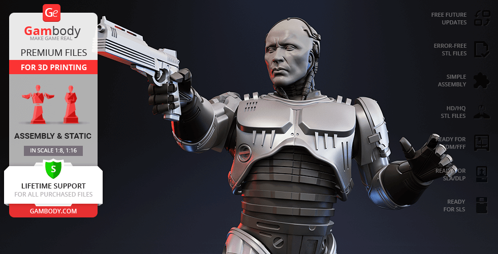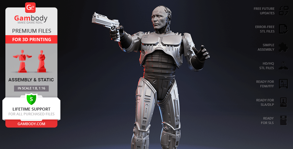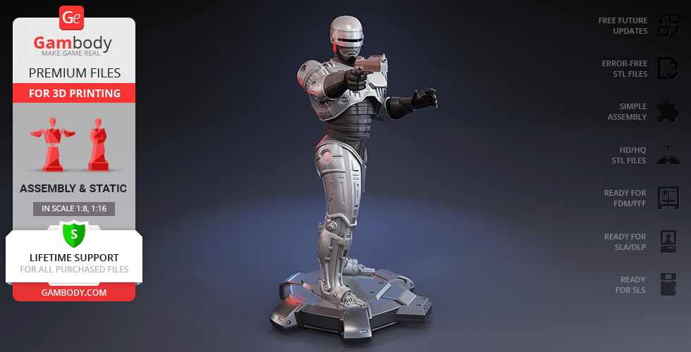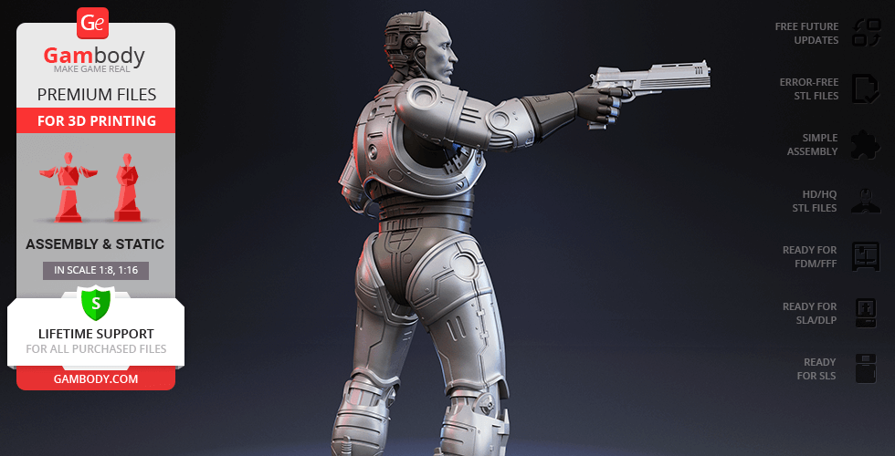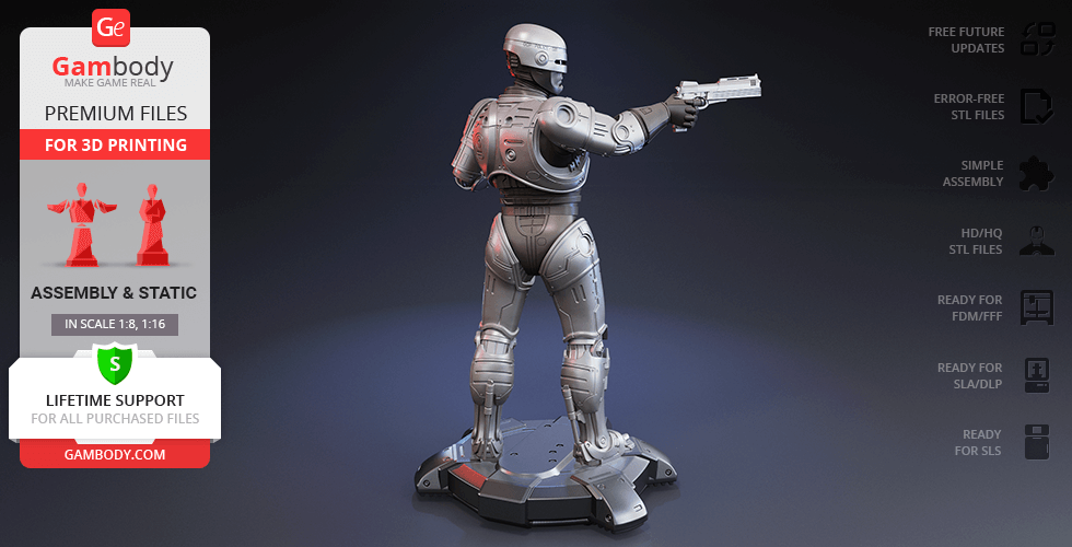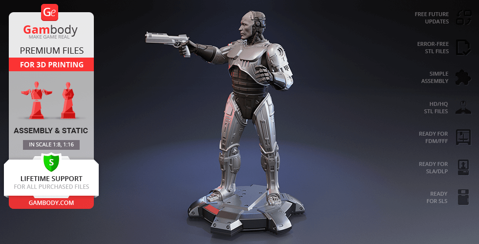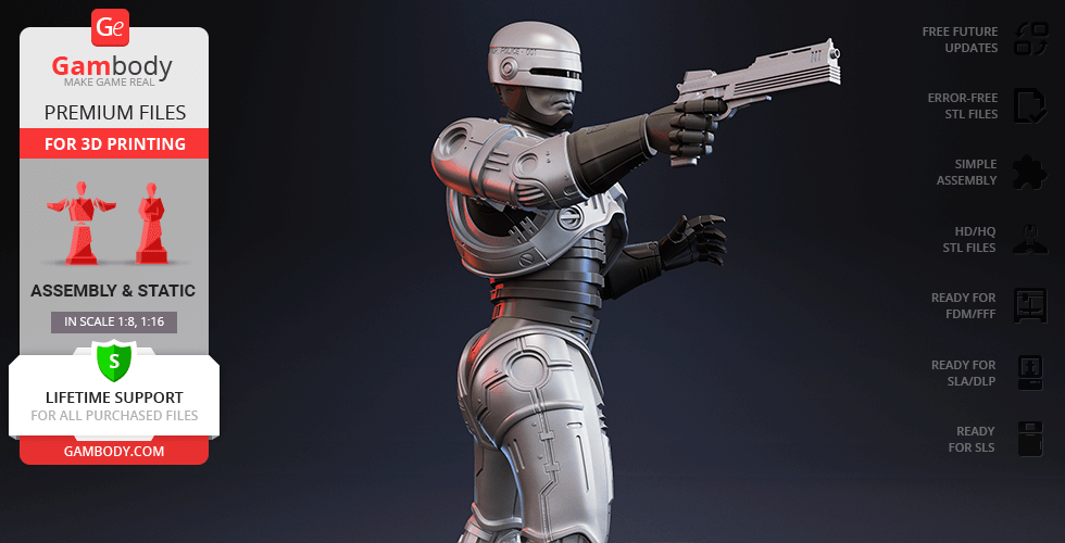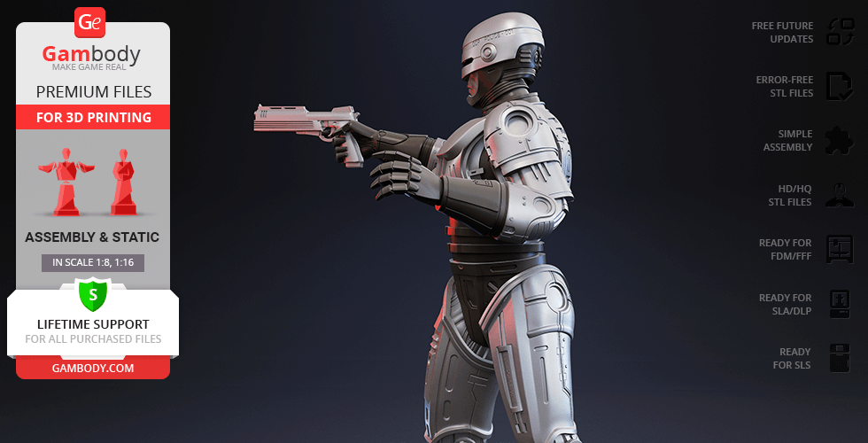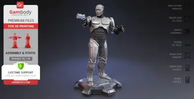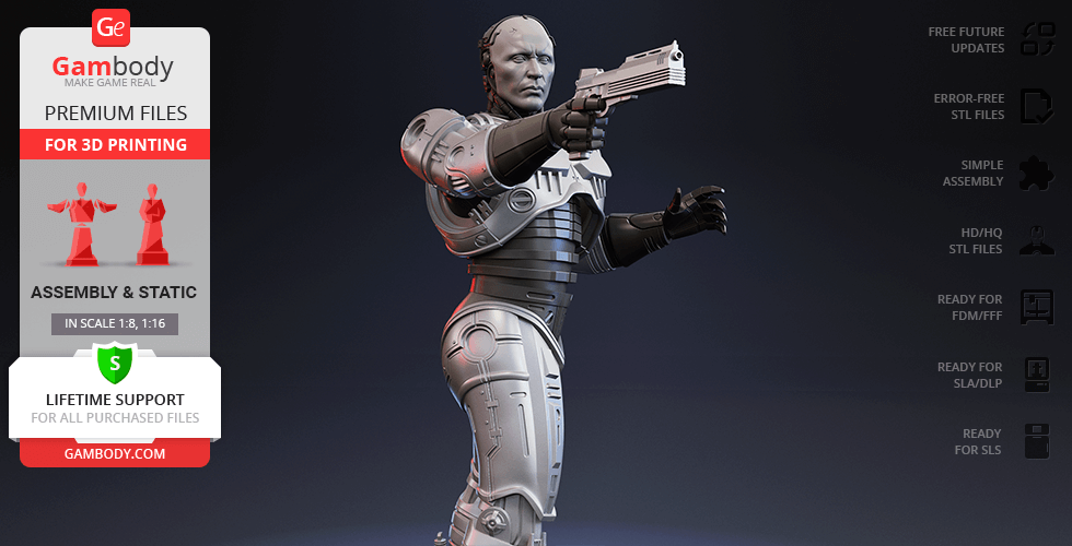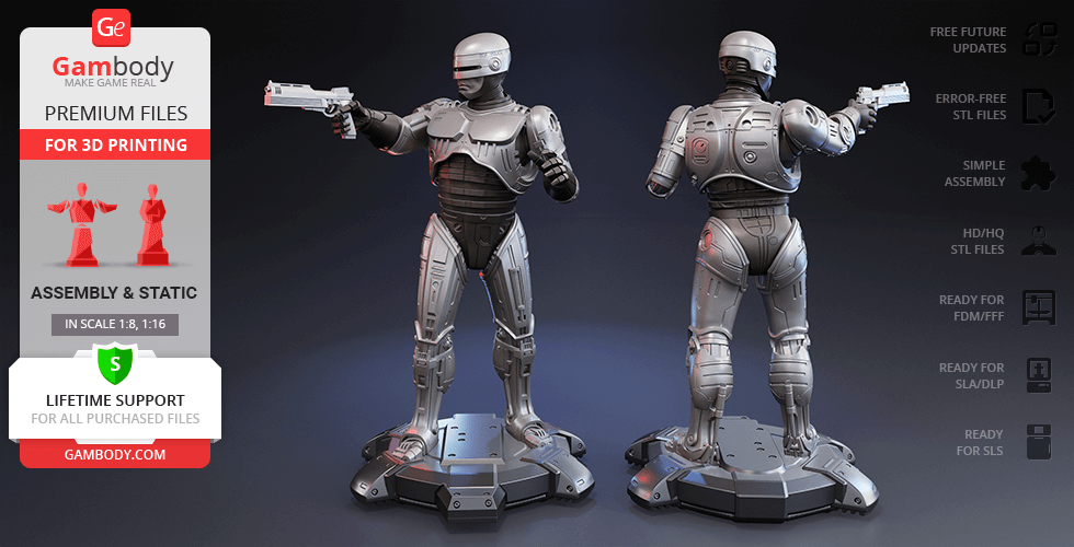 RoboCop 1987 3D Printer Files | Assembly includes 3 version(s) for the supported 3D printer type(s): FFF/FDM, DLP/SLA, SLS. Files are available for download after purchase.