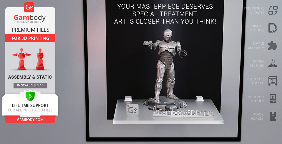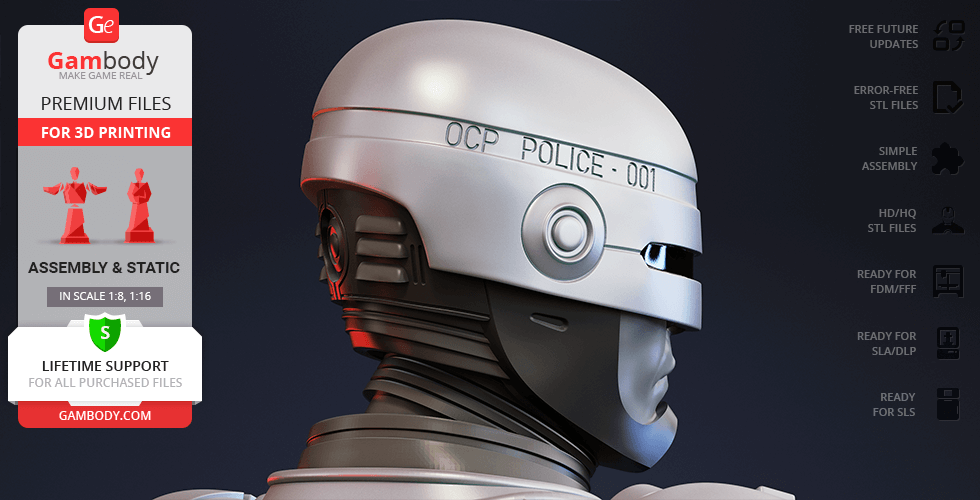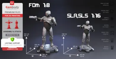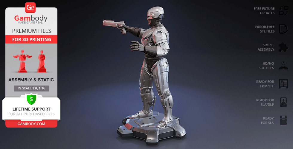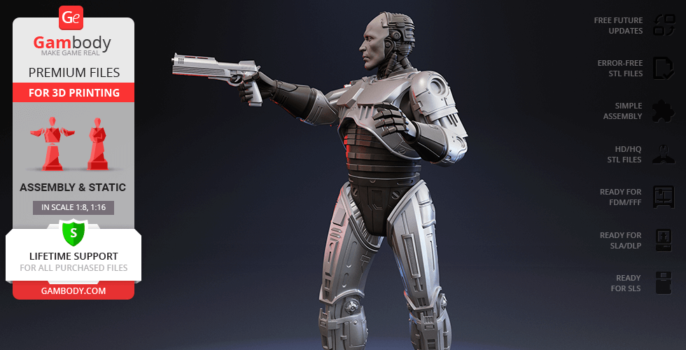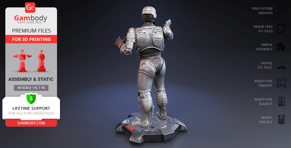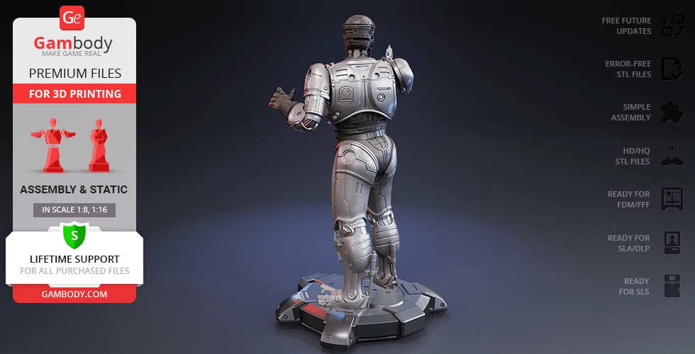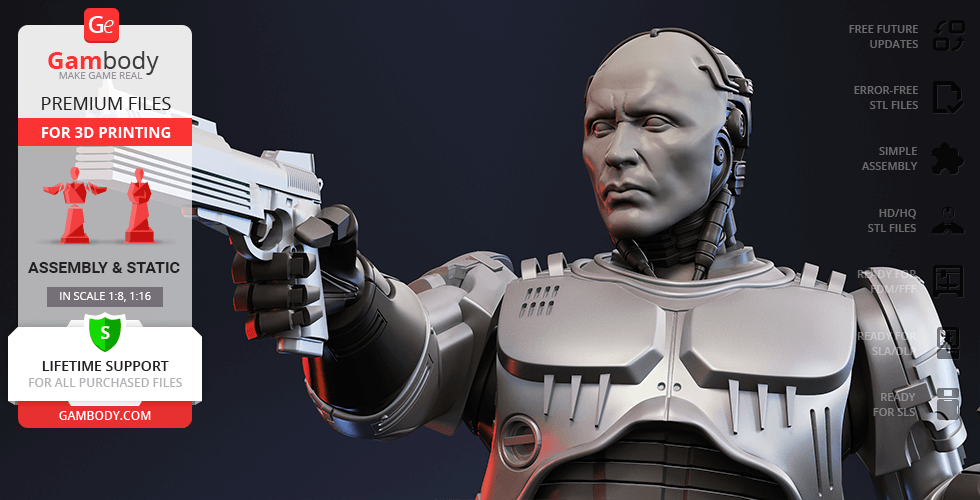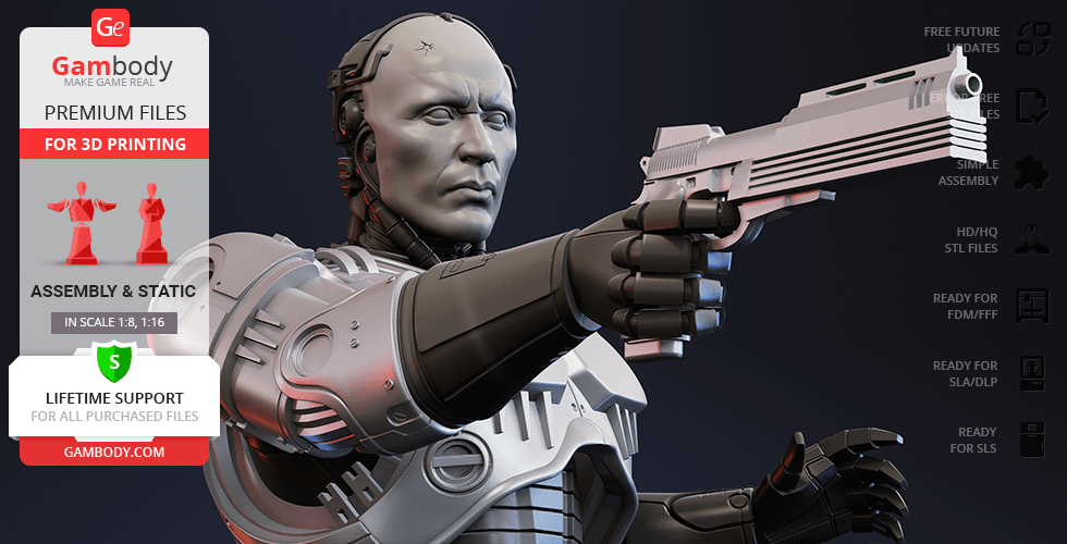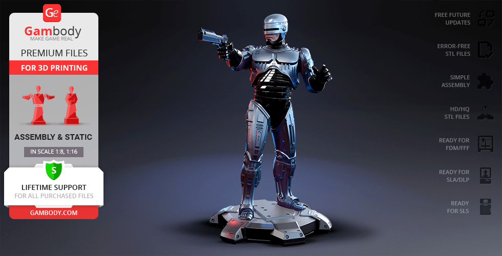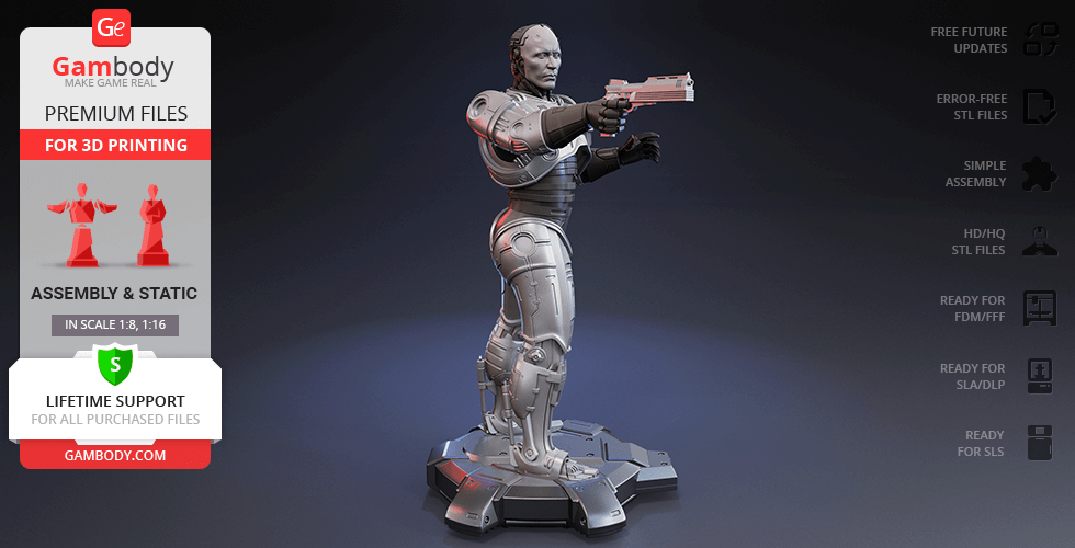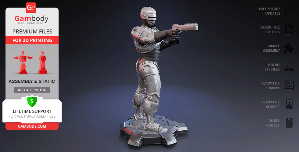 RoboCop 1987 3D Printer Files | Assembly includes 3 version(s) for the supported 3D printer type(s): FFF/FDM, DLP/SLA, SLS. Files are available for download after purchase.