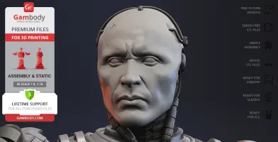 The STL files that this version comprises are pre-supported, hollowed out, and have drain holes where needed. Fully revised cutting that improves the way the assembly parts fit into average resin 3D printers. You may choose to print the STL files one by one or several at once, depending on the dimensions of your resin 3D printer's build plate. When slicing several STL files at once, the attachment layers (Platform Touch Shape) may overlap, but the supports must not come into contact. Two variants of the head: RoboCop can be displayed wearing the helmet or without it. The assembly parts are connected using specially designed integrated connectors that fit securely into the corresponding slots. Optionally, for added strength and rigidity, the static connections can be glued together;
