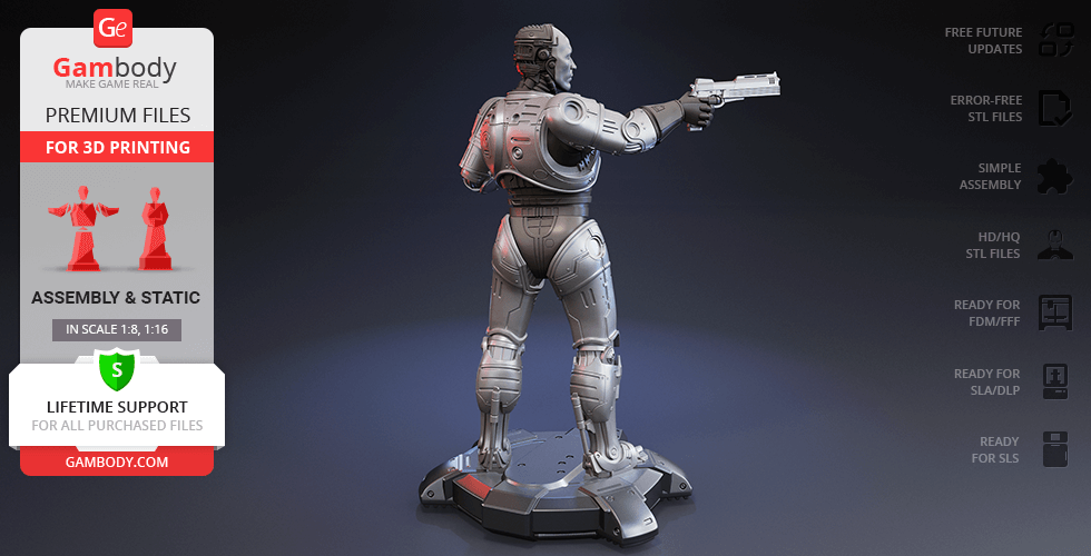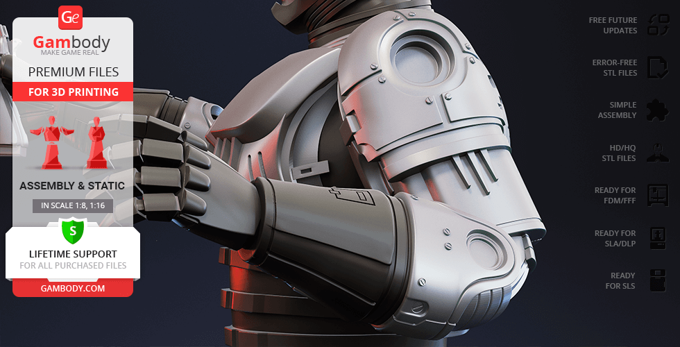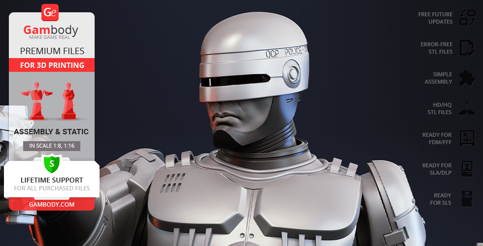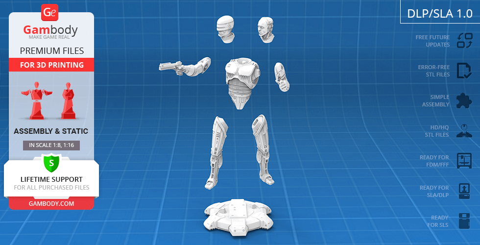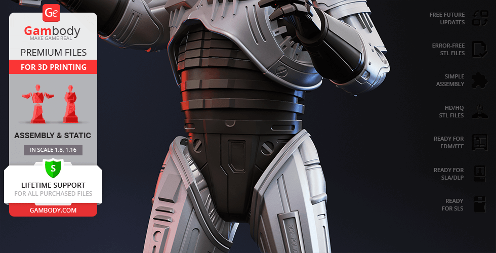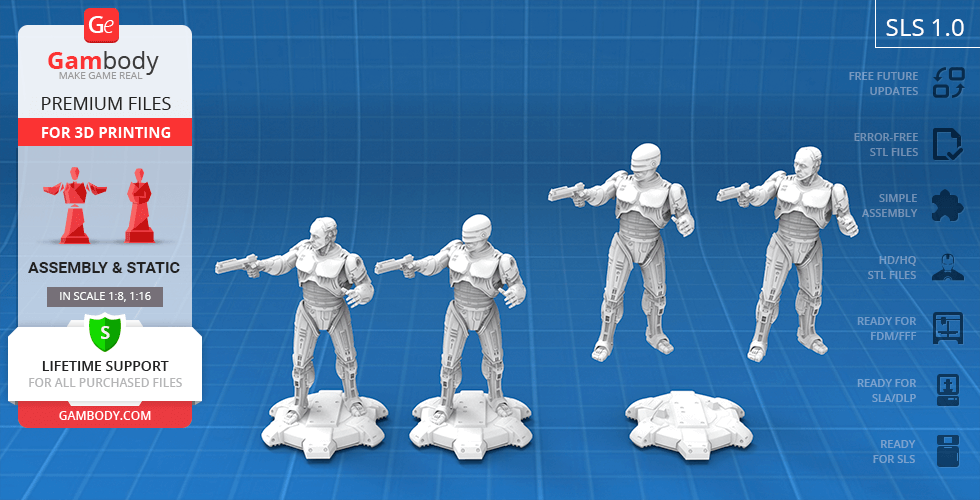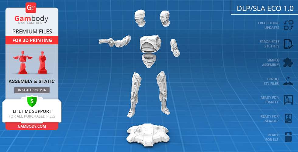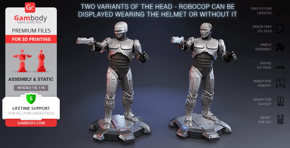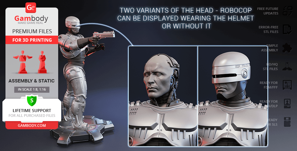 • 5 versions of RoboCop 1987 STL files for FFF/FDM, DLP/SLA, DLP/SLA Eco, DLP/SLA Pre-supported and SLS files for all versions are available for download after the purchase;