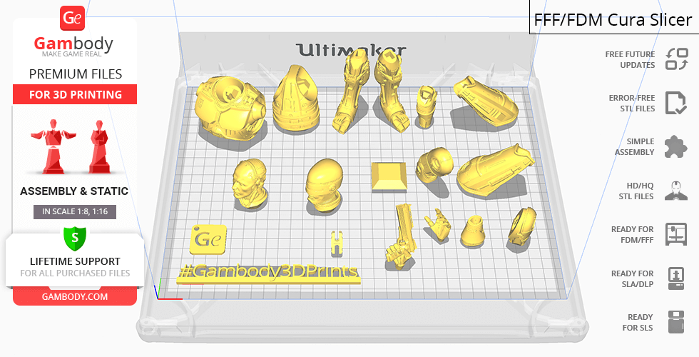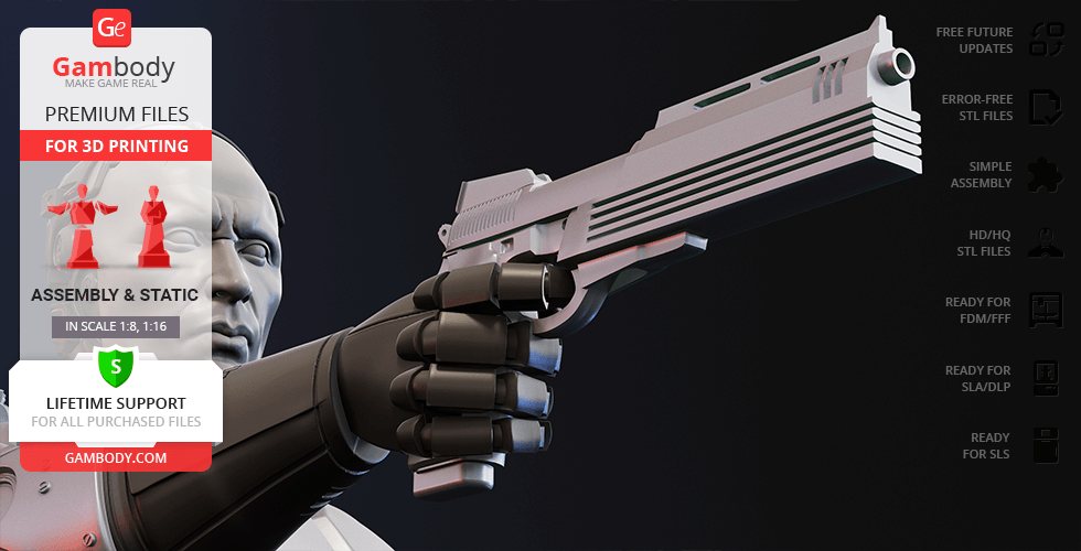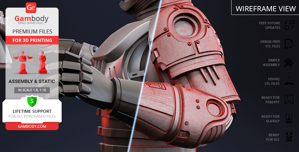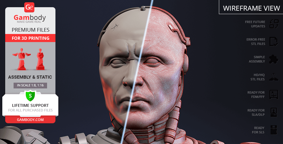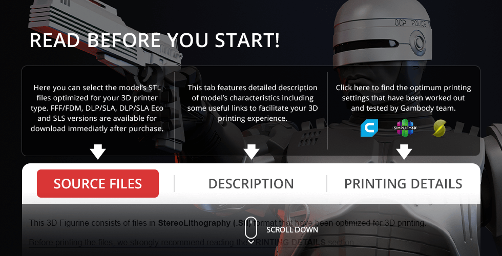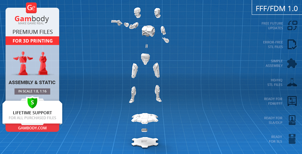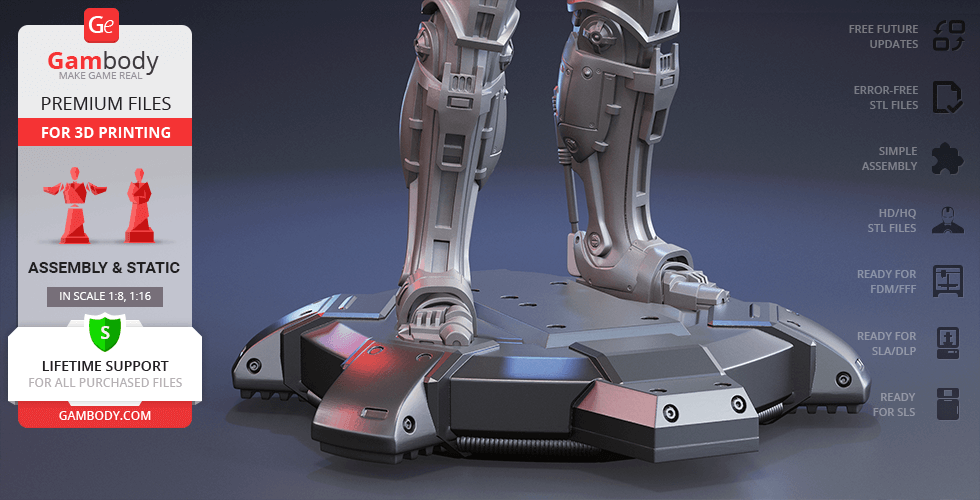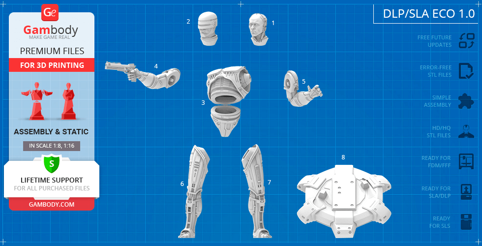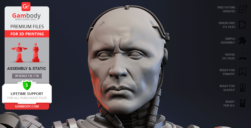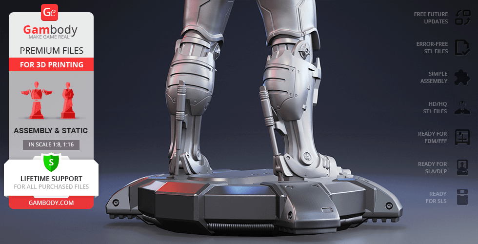 • 5 versions of RoboCop 1987 STL files for FFF/FDM, DLP/SLA, DLP/SLA Eco, DLP/SLA Pre-supported and SLS files for all versions are available for download after the purchase;