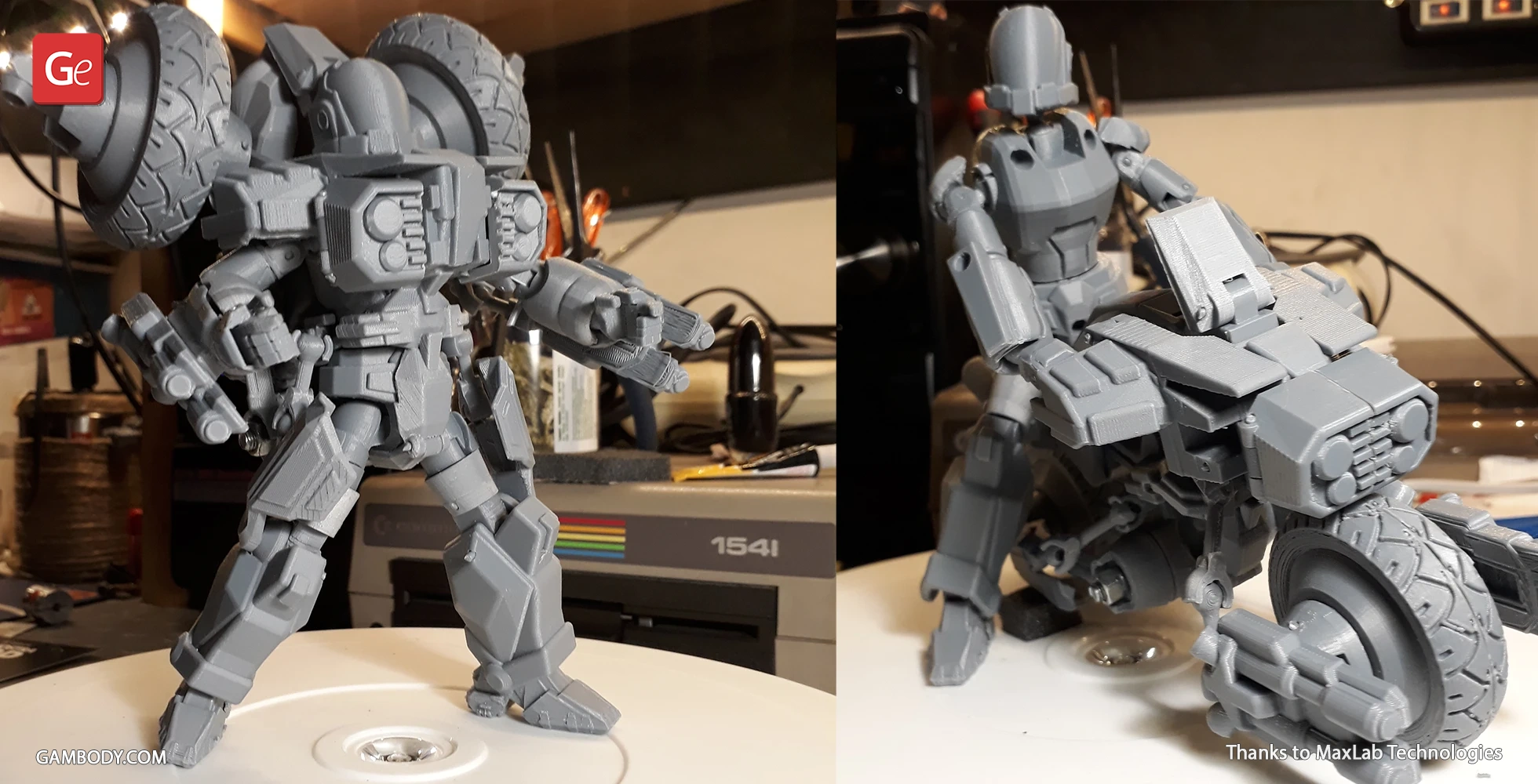 VR-052 Cyclone model for 3D printing is a highly articulated assembly model and its moderation and adaptation for different types of 3D printers took Gambody team 38 hours in total. In order to ensure the robot’s transformation between two modes, Cyclone was divided into many assembly parts. For you to switch the assembled Cyclone between Motorcycle and Armour modes all model’s joints were designed to presuppose the introduction of certain mechanisms. All the assembly parts are provided in STL files in recommended positions that were worked out in order to ensure the smoothness of details’ surfaces after printing and so that the 3D printing beginners won't face difficulties when placing the parts on a build plate. In order to assemble the model, you will need one 5x48 mm self-tapping screw and short pieces of 1.75 PLA to make pins. Apply the glue where you feel appropriate. Make sure to watch "Assembly video" in the photo preview section where you can also see the full transformation from motorcycle mode into armour mode filmed by the author of the model.