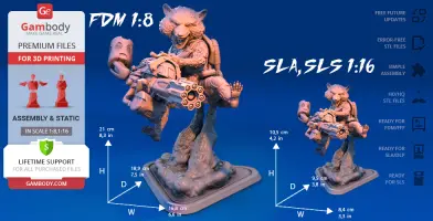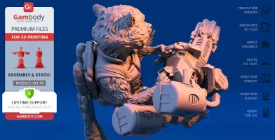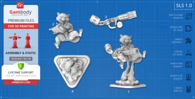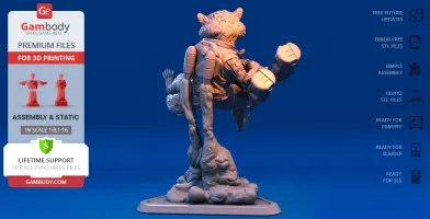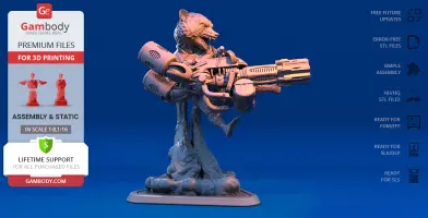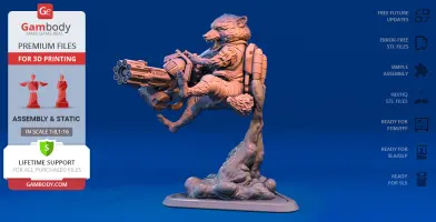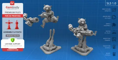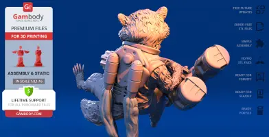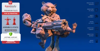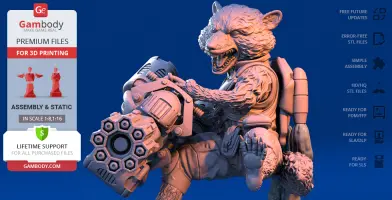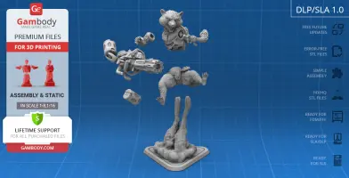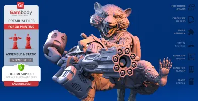 - STL files of Rocket Raccoon 3D Model for 3D printing which consist of 51 parts;- 4 versions of files for this model for FFF/FDM, DLP/SLA, DLP/SLA Eco and SLS;- High-poly detailed figurine of Rocket Raccoon;- Detailed settings that we provide for Cura , Simplify3D and Slic3r for the best print;- Full technical support from the Gambody Support Team.