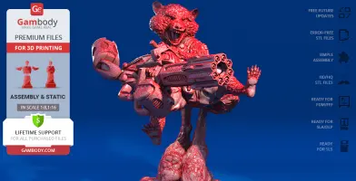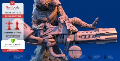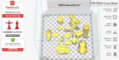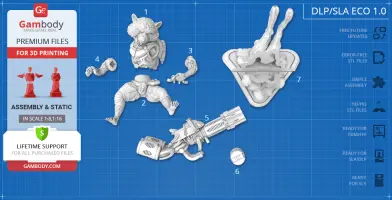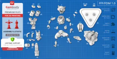 FDM version features:- Contains 33 parts;- Assembly kit includes Locks. One part of Lock (32_Ge_lock_7S_x4) needs to be printed 4 times; One part of Lock (33_Ge_lock_10H(x1)) needs to be printed 1 time;- Made with plasma weapon and jetpack;- Made in flying pose with platform;- All parts are divided in such a way that you will print them with the smallest number of support structures.