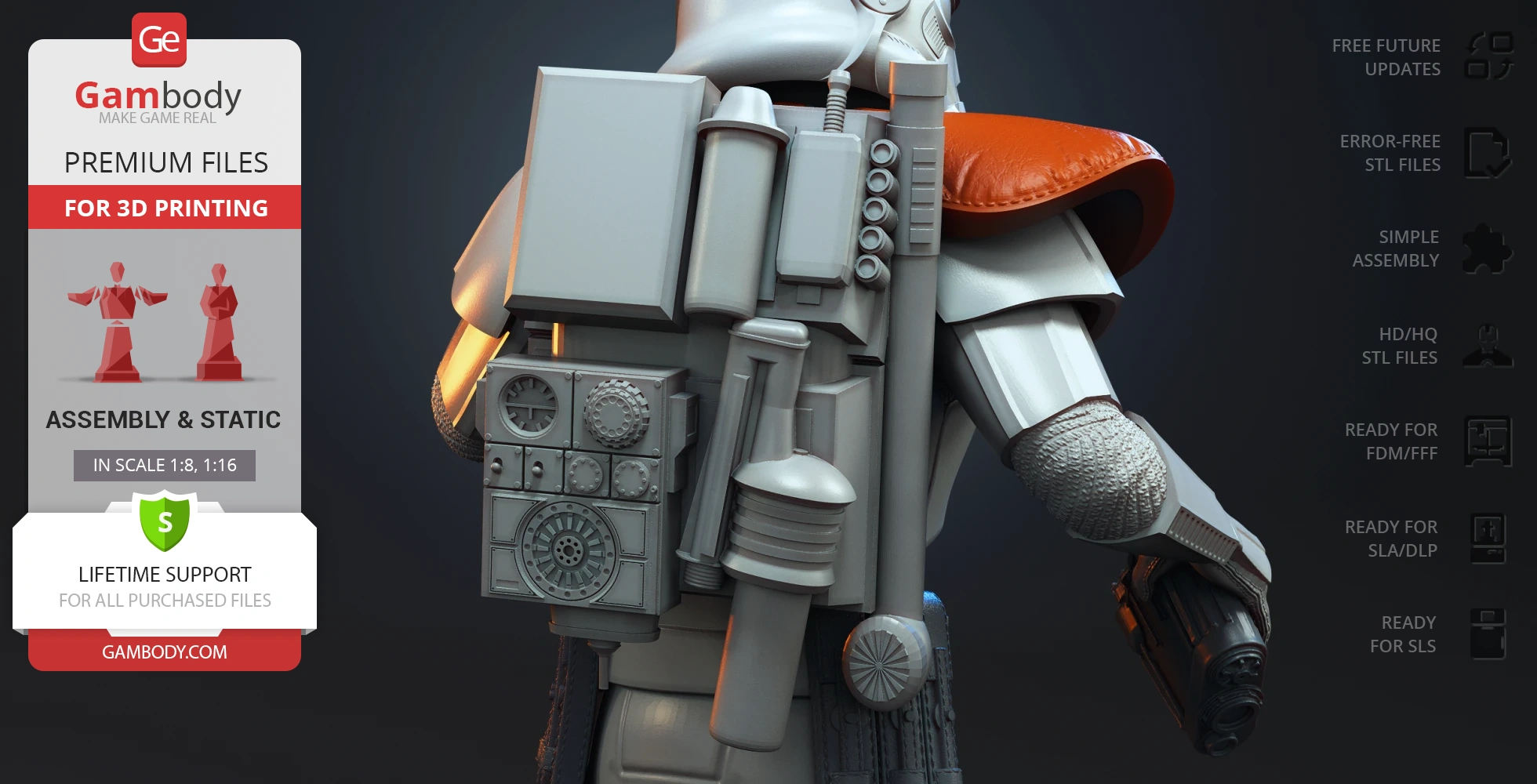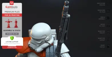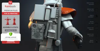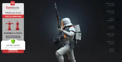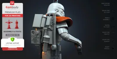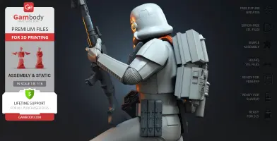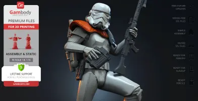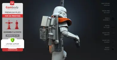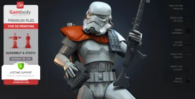 Star Wars sand trooper for 3D printing from Gambody contributor is a work that impresses at first sight. It is very interesting to explore the accessories of the soldier: the blaster rifle the sandtrooper holds in his left hand, in addition to its spectacular scale and level of detail, is an element that plays an important role in the chosen posture of the 3D model as it transmits the confidence of the owner. The orange color of the pauldron of the combatant indicates his belonging to the unit leaders. The design of the armor, helmet, and survival backpack is so close to the original movie character look that you will be amazed by the opportunities these 3D print files give. Are you ready to start a new 3D printing adventure?