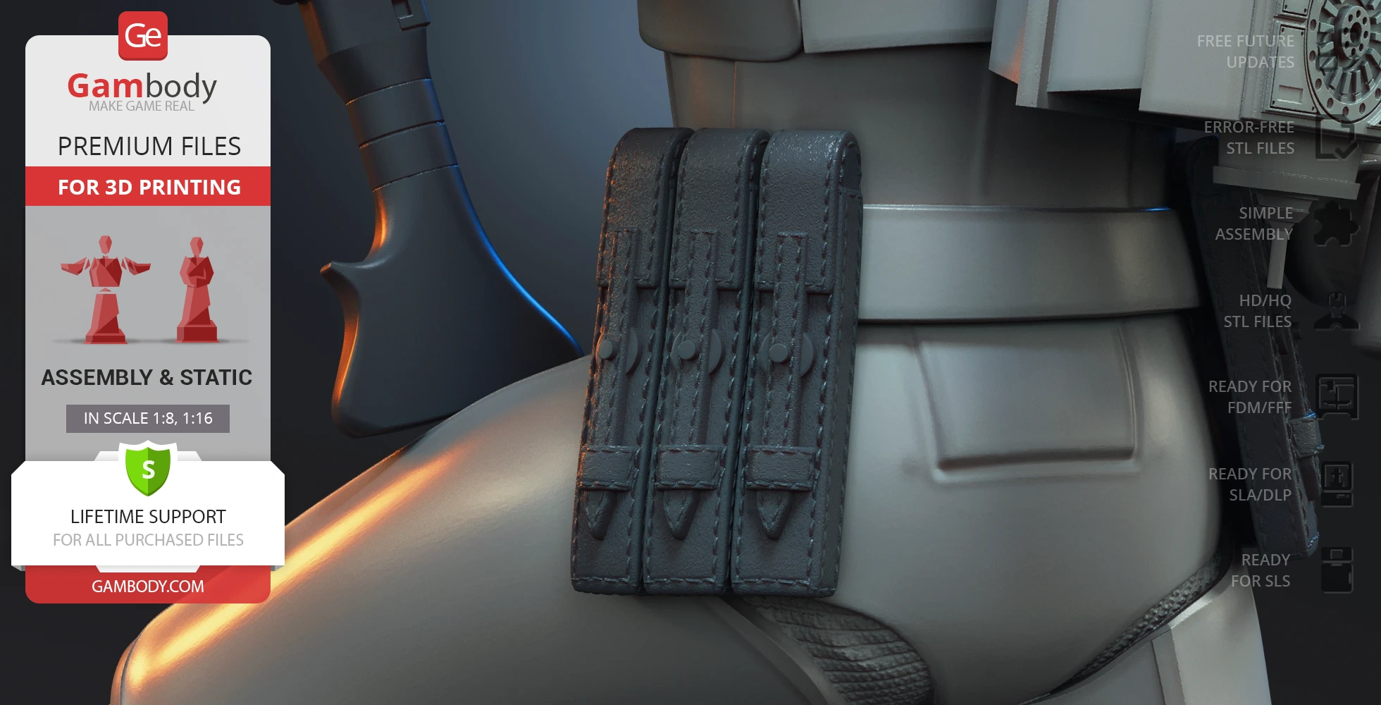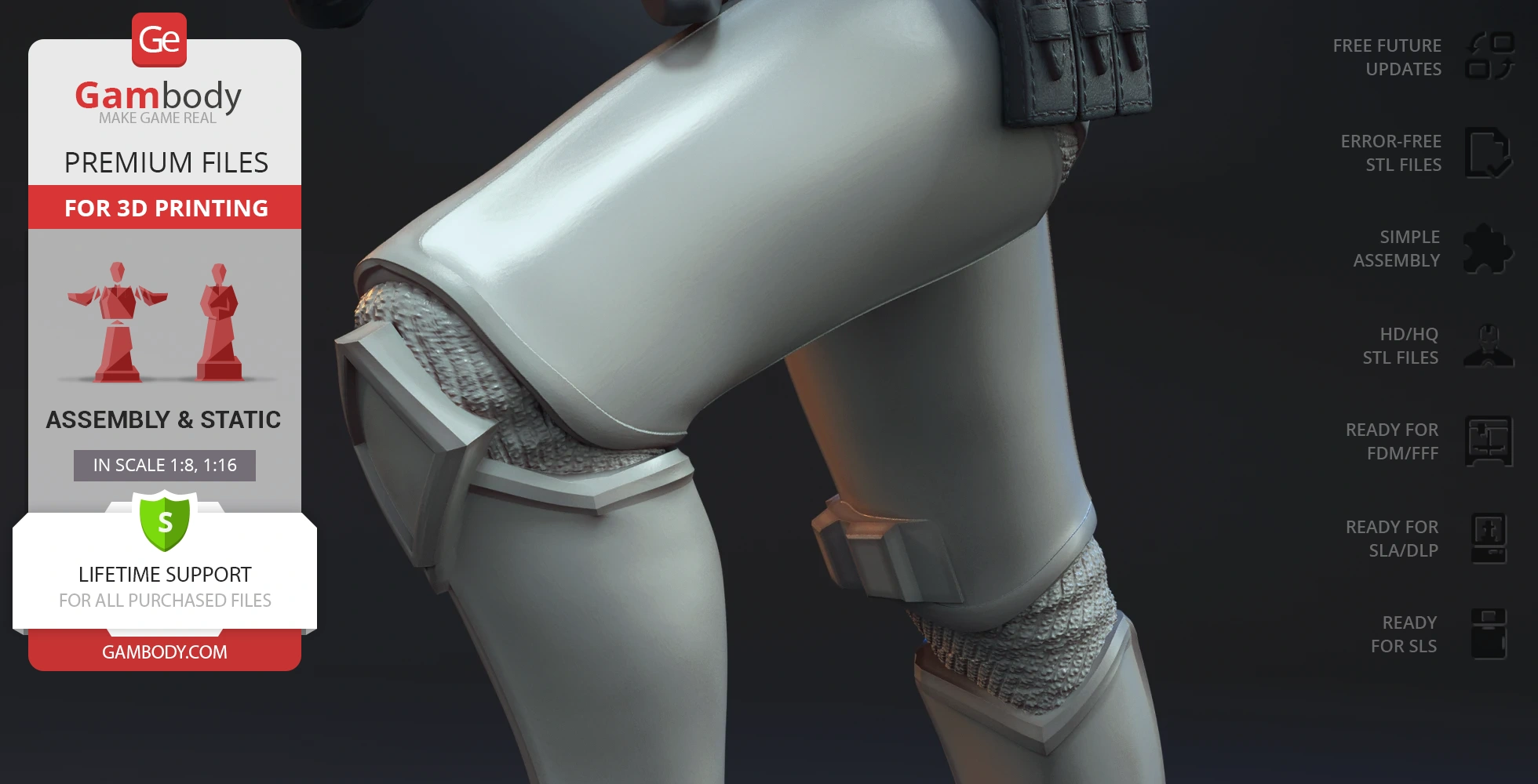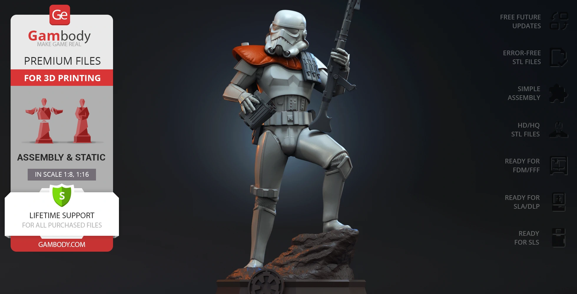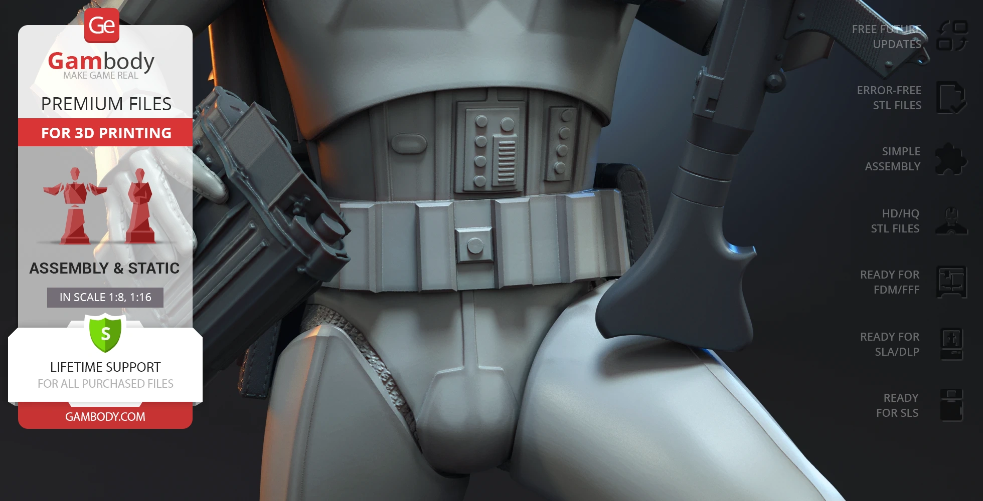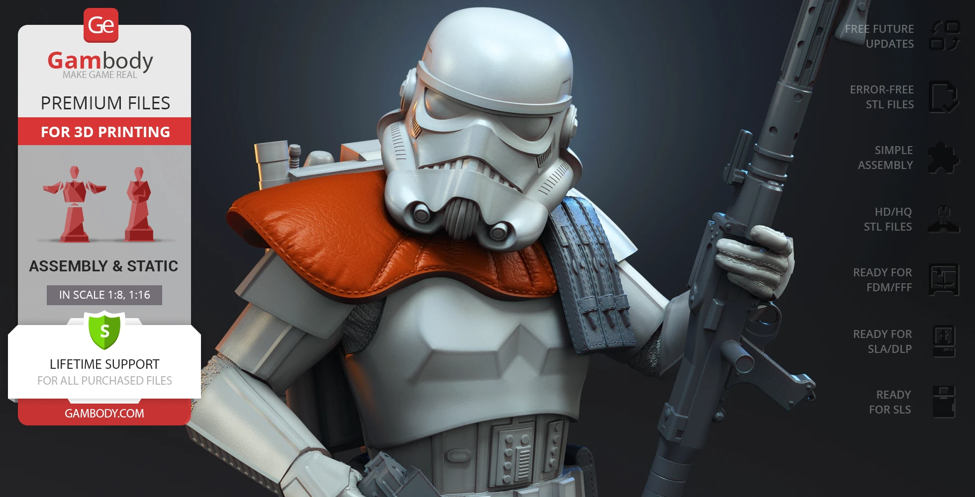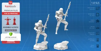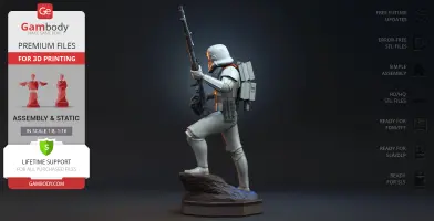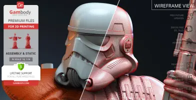 Sandtrooper for 3D printing is a static assembly model and its moderation and adaptation for different types of 3D printers took the Gambody team 59 hours in total. The 3D print's anatomy, proportions, and flow of the cloth were thoroughly reviewed during the moderation process for the desert trooper to be depicted harmoniously in the intended pose.