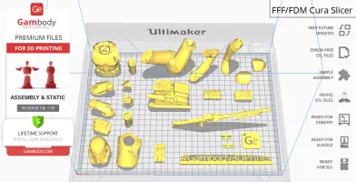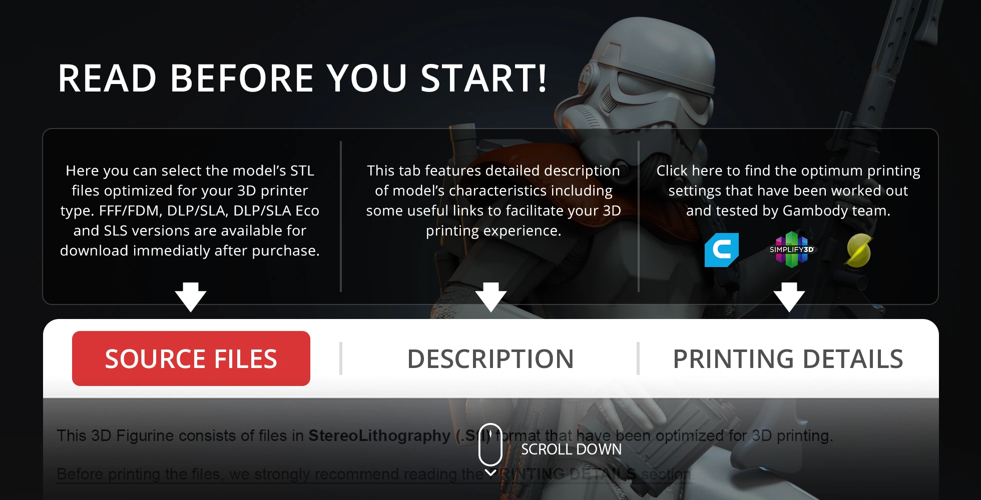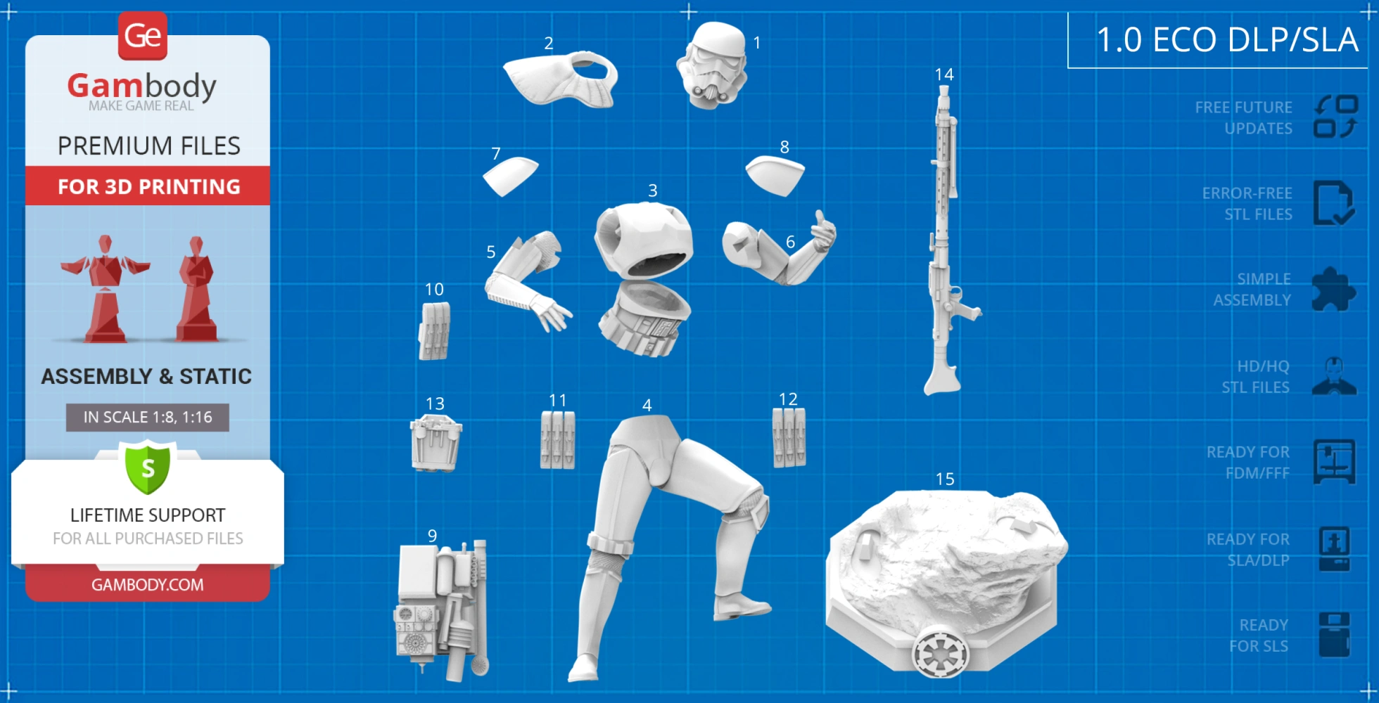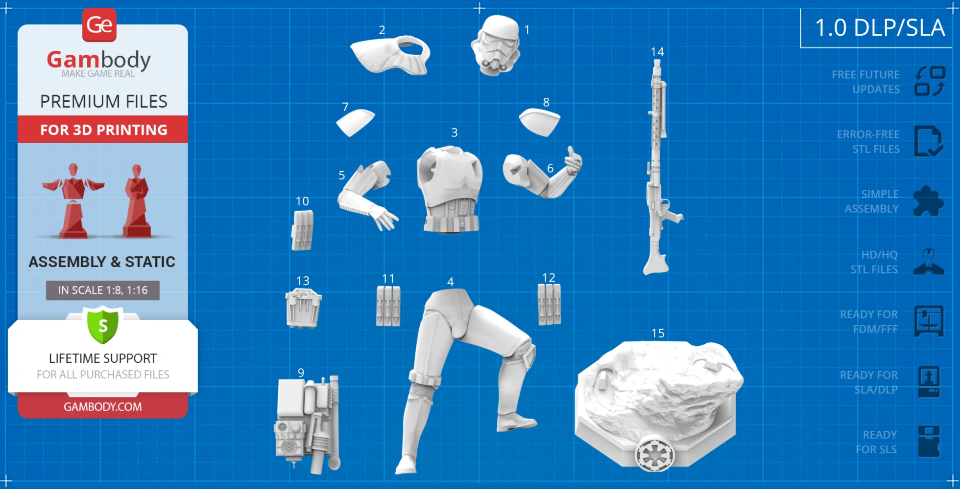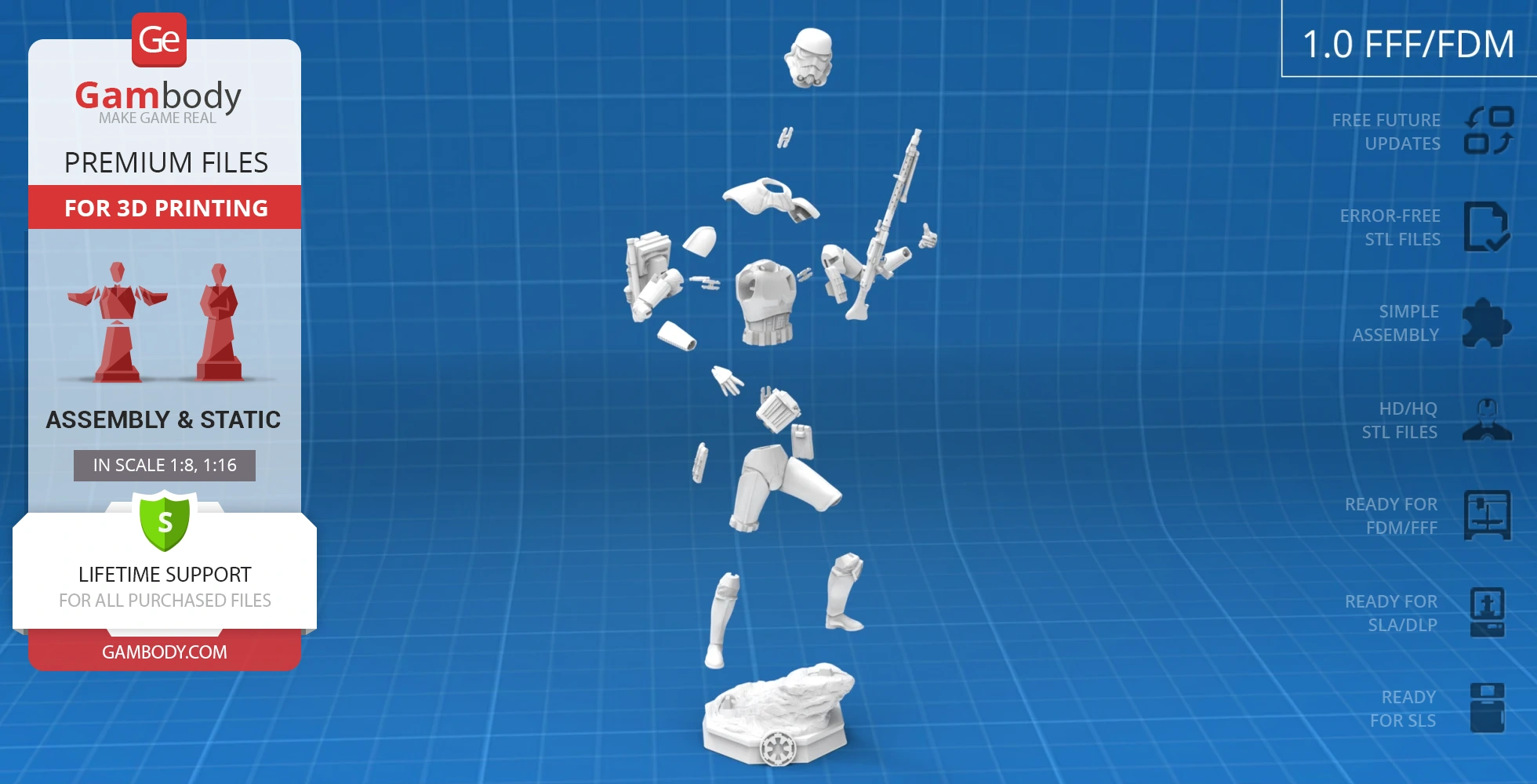 All assembly parts in the FFF/FDM 1.0 versions are provided in STL files in recommended positions that were worked out in order to ensure the smoothness of the details’ surfaces after printing and that the 3D printing beginners won't face difficulties when placing the parts on a build plate. When downloading any model's file you will also receive "Assembly Manual" for FFF/FDM 1.0 and DLP/SLA 1.0 versions in PDF format. We highly recommend that you get acquainted with the “Assembly Video” and "Assembly Manual" before getting down to Sandtrooper 3D printer files.