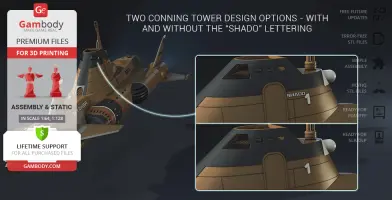 All assembly parts in the FFF/FDM 1.0 version are provided in STL files in recommended positions that were worked out in order to ensure the smoothness of the details’ surfaces after printing and that the 3D printing beginners won't face difficulties when placing the parts on a build plate. When downloading any model's file you will also receive "Assembly Manual" for FFF/FDM 1.0 and DLP/SLA 1.0 versions in PDF format. We highly recommend that you get acquainted with the “Assembly video” and "Assembly Manual" before getting down to the SHADO Skydiver submarine.