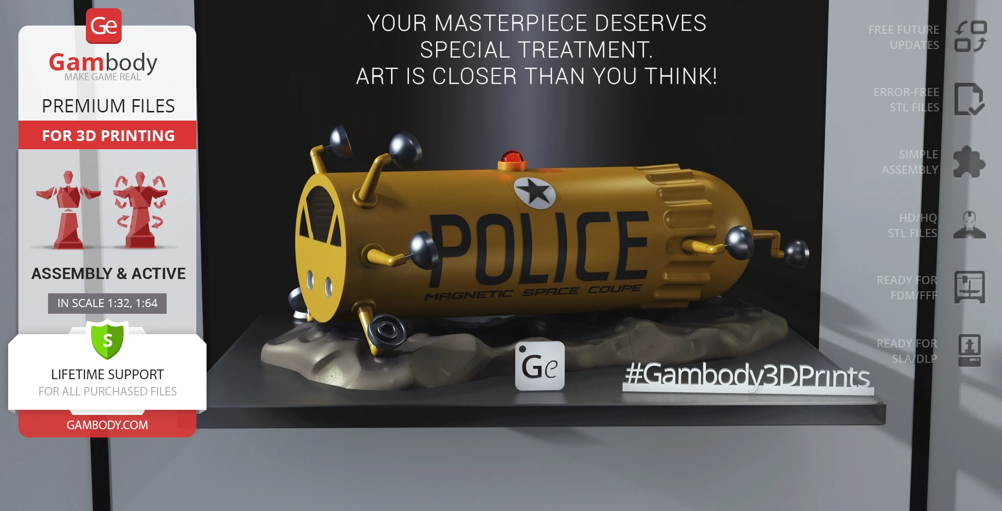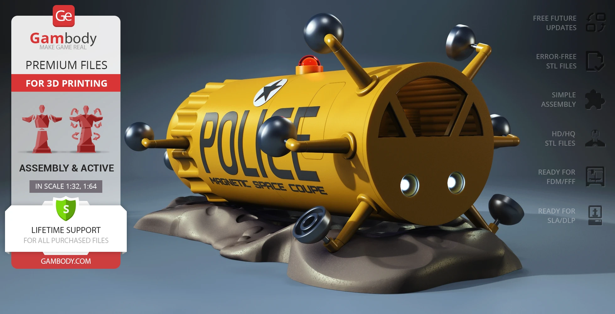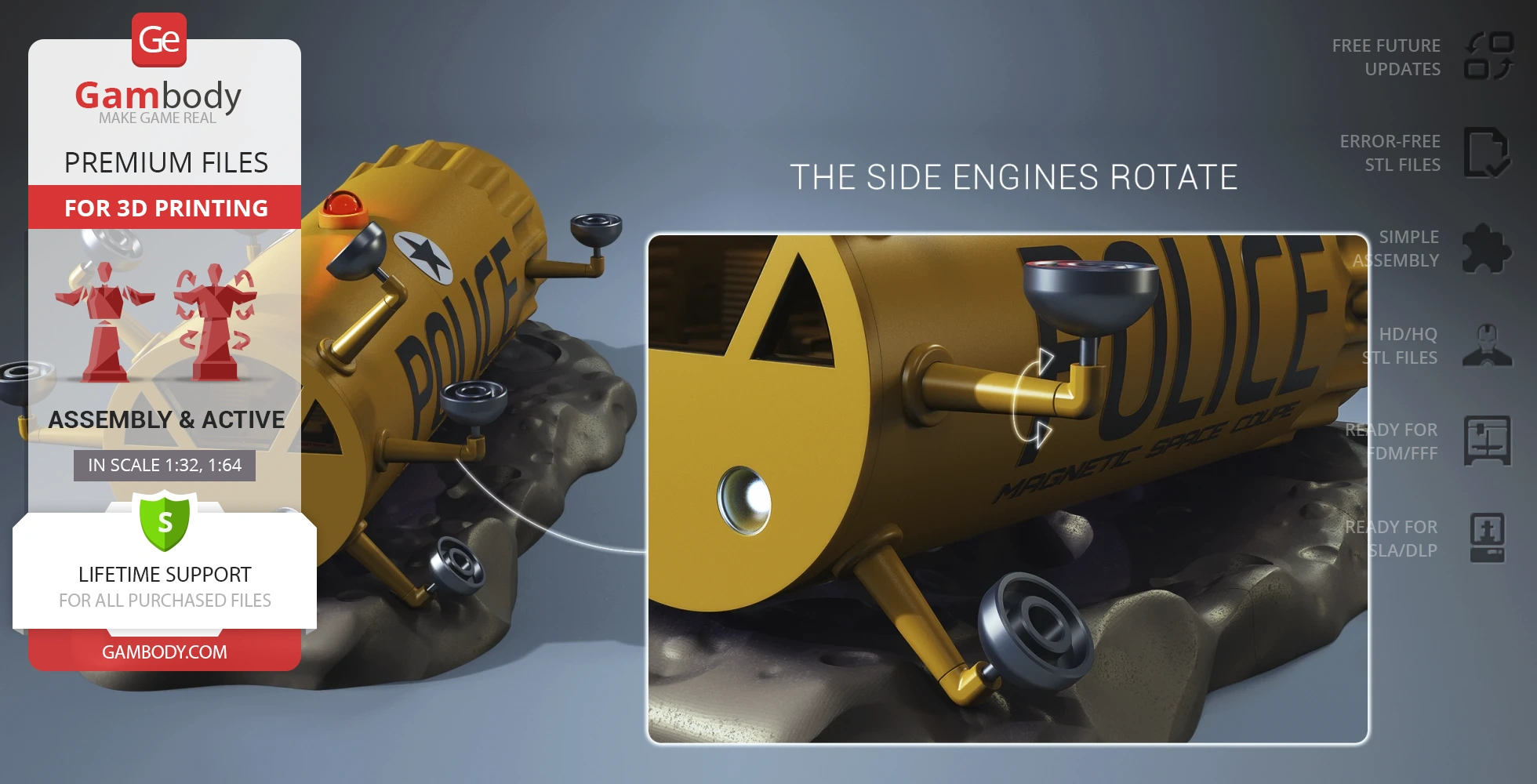 The Tracy’s Space Coupe model for 3D printing is a static assembly model and its moderation and adaptation for different types of 3D printers took the Gambody team 79 hours in total.