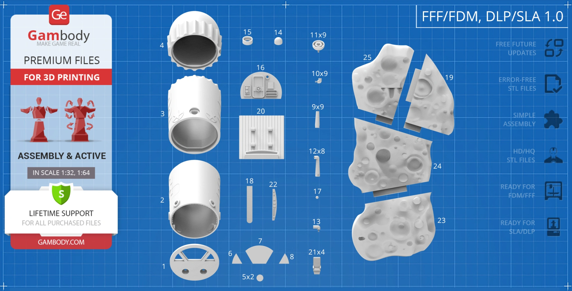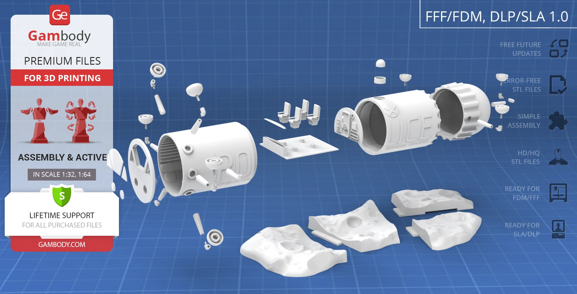 All assembly parts in the FFF/FDM 1.0 version are provided in STL files in recommended positions that were worked out in order to ensure the smoothness of the details’ surfaces after printing and that the 3D printing beginners won’t face difficulties when placing the parts on a build plate. When downloading any model’s file you will also receive “Assembly Manual” for FFF/FDM 1.0 and DLP/SLA 1.0 versions in PDF and video formats. We highly recommend that you get acquainted with the “Assembly Video” and “Assembly Manual” before getting down to the Tracy’s Space Coupe 3D printing model.